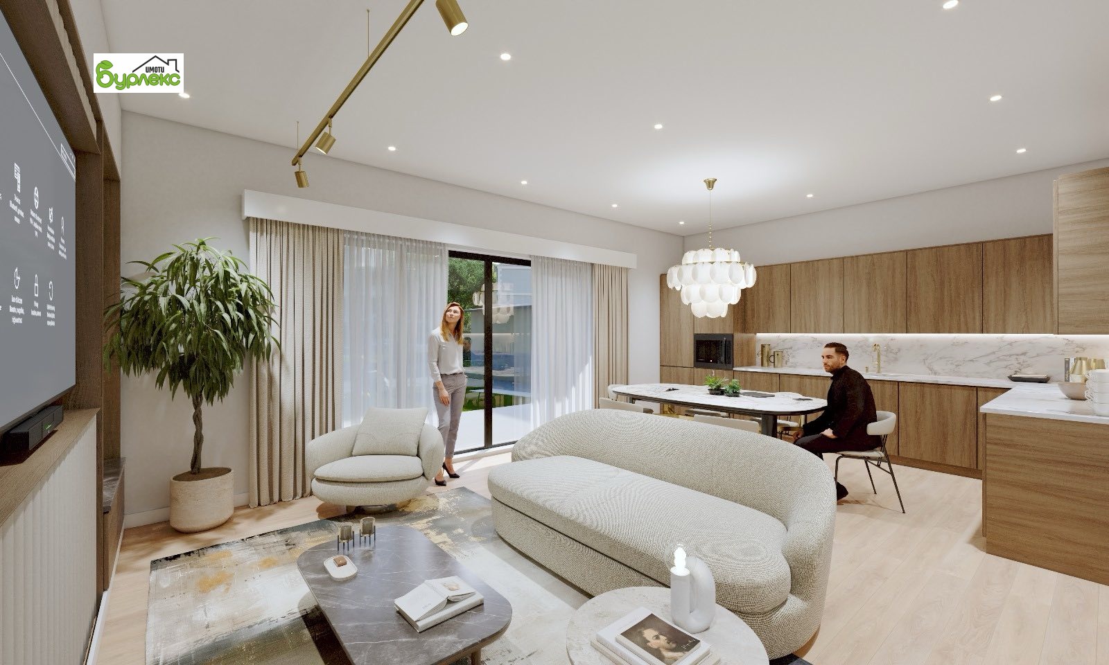 Апартаментът е ситуиран на партерен етаж, проектиран с акцент върху оптималните светли височини, прави форми и ясни обеми.