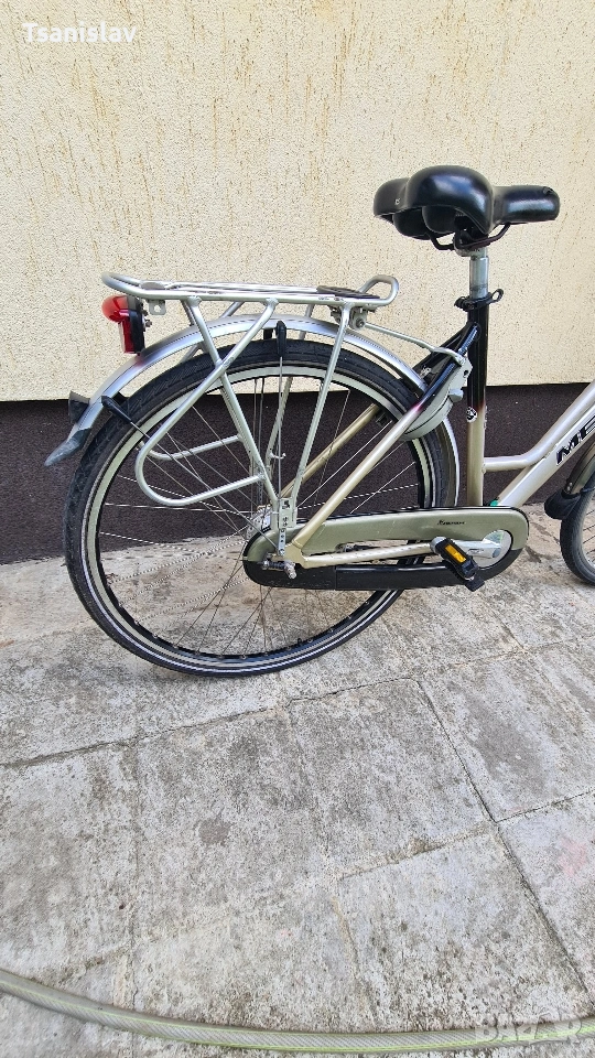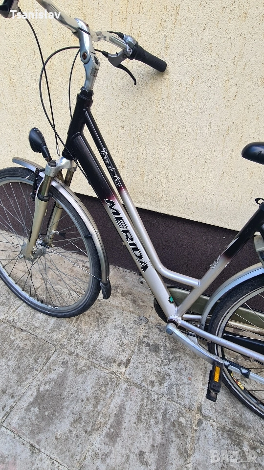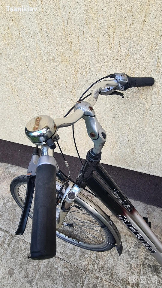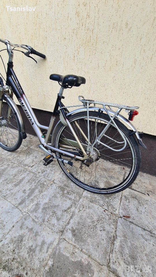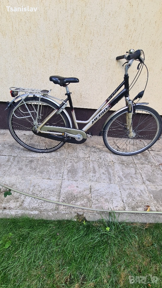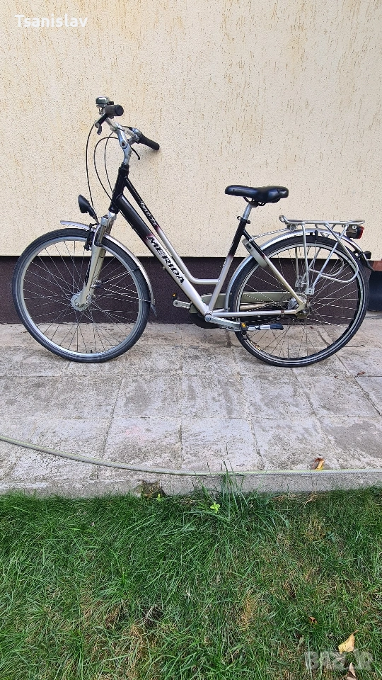 Алуминиев градски велоспед MERIDA 28"цола. С 7-скорости амортисьорна вилка, предна и задна светлина, за безопасност. Заключване на задната капла против кражба.
