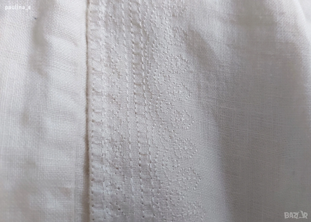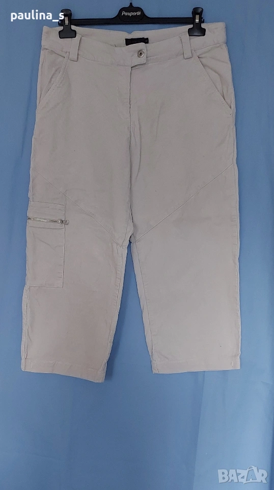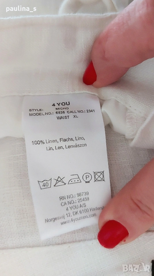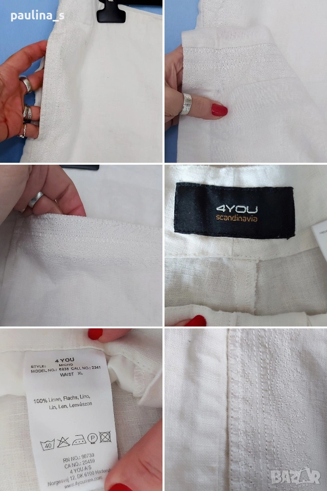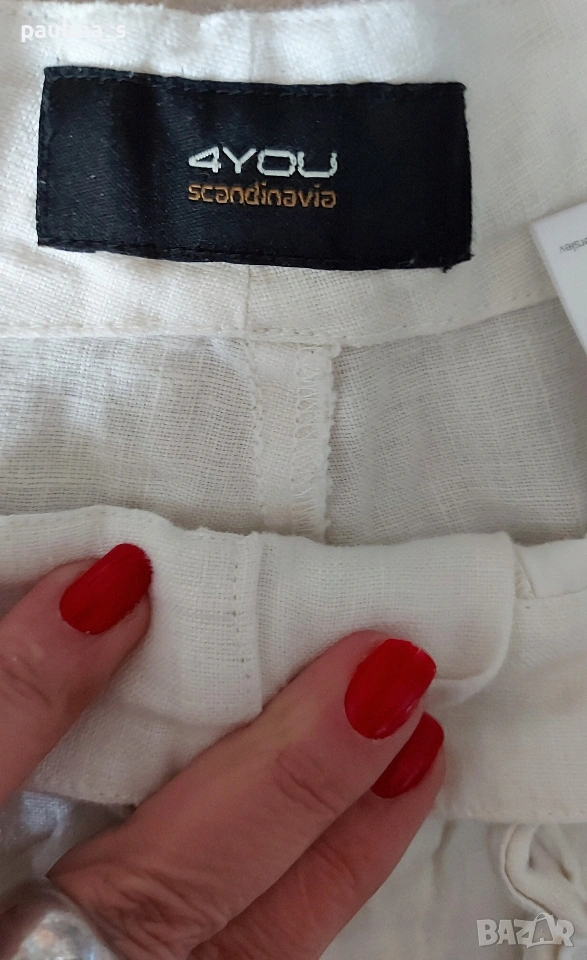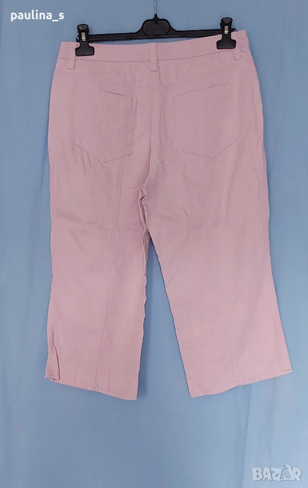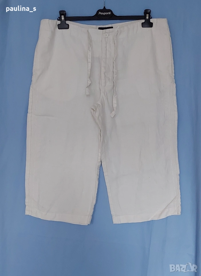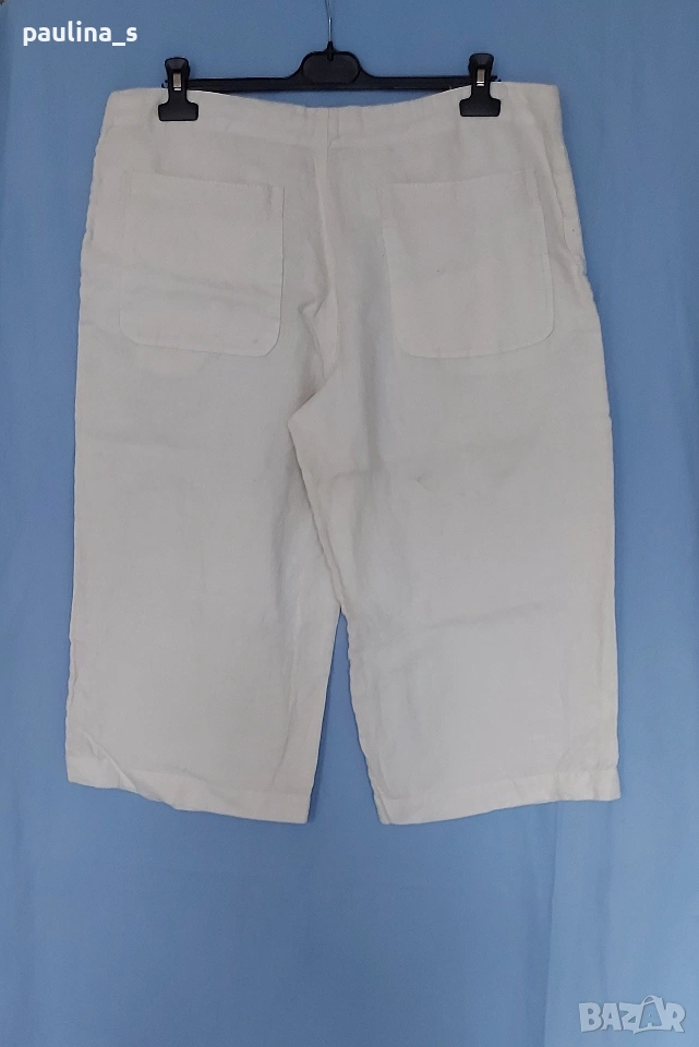 XL / 2XL - "4 you". Цената е крайна, без пазарлъци 17 евро. Ленени бермуди с бродерия, нормална талия. Моделът е свободен, декорациите са от бродерия с перлен отблясък. Джобовете са в страничните тегели, без да променят шейпът на ханша. Ленът е скъпа и капризна материя. Държи прохладно и има хипоалергично свойство. Като нови са, една бройка.