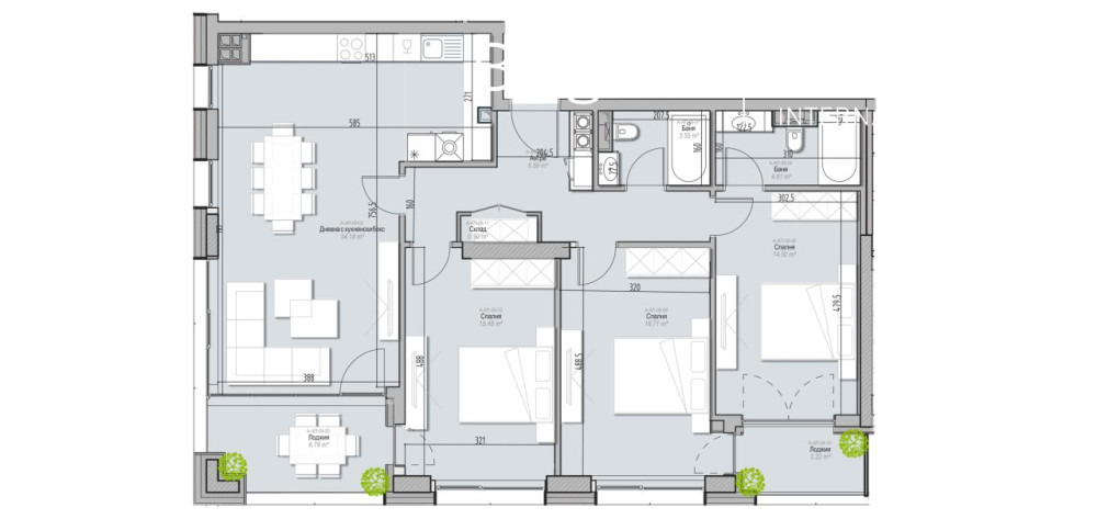 Разпределениe: дневна зона с кухненски бокс и трапезария, три спални, две бани,две тераси.