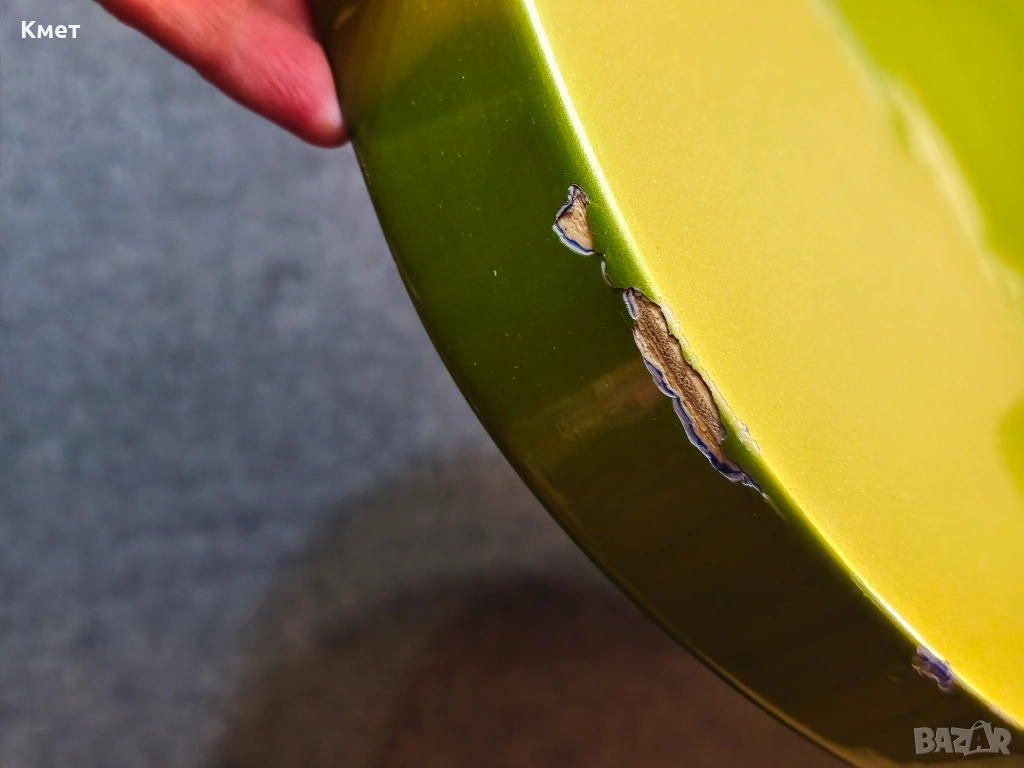 1. фабрично явно е била синя на цвят и някой я е боядисал зелена отгоре