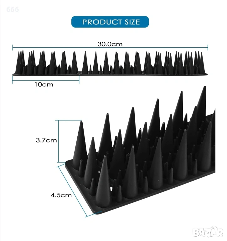 [Спецификации и размери] Шиповете за гълъби са черни и се предлагат в опаковка от 20 броя, с размери 30 см дължина, 4,5 см ширина и 3,7 см височина, което ги прави подходящи за ежедневна употреба. Можете също така да свържете шиповете за птици, за да покриете по-голяма площ.