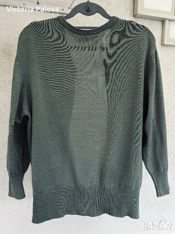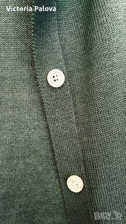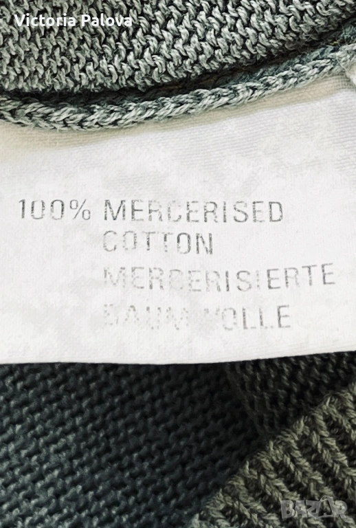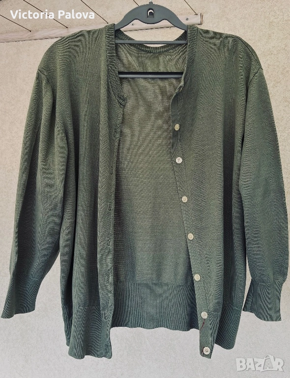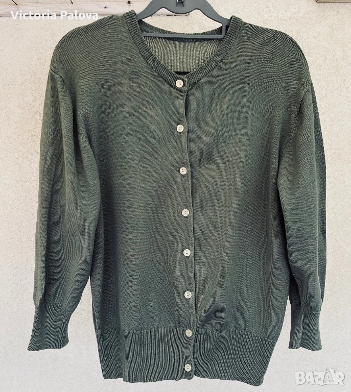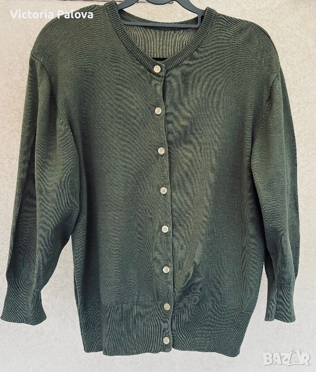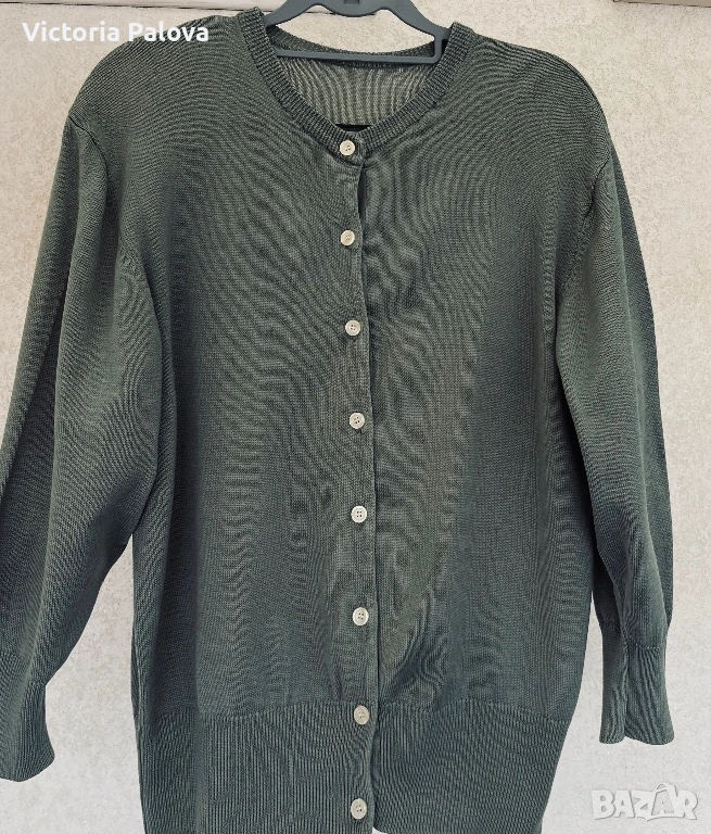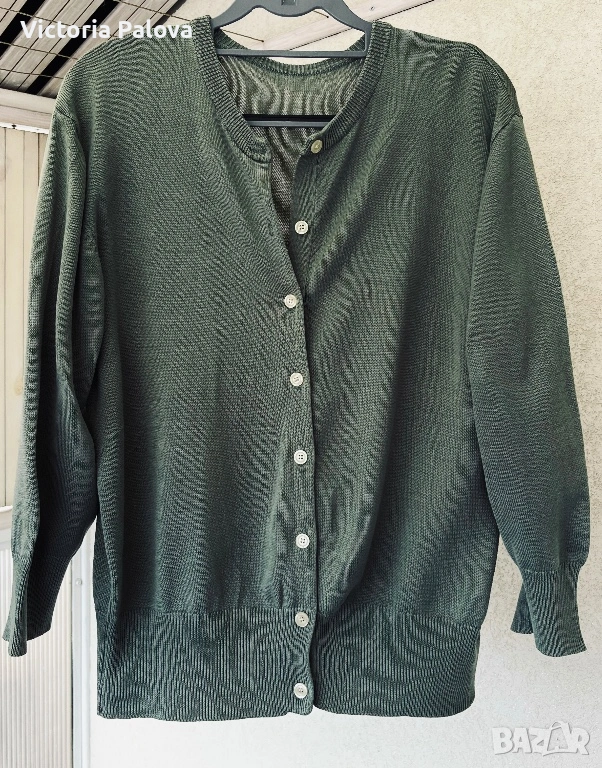Елегантна жилетка от плетен мерсеризиран памук в наситен цвят olive , размер 42, с копчета отпред и модерен широк ръкав. Изработена от памук, обработен чрез специална и по-скъпа технология – мерсеризация, която прави нишките по-гладки, по-здрави и придава характерен фин блясък, типичен за по-висок клас изделия. Тази обработка отличава дрехата от обикновения памук – стои по-луксозно, запазва формата си по-добре и е изключително приятна на допир. Кройката пада красиво по тялото, а жилетката може да се носи както върху дреха, така и директно на голо тяло за модерна и женствена визия. Красива, качествена и различна – дреха, която ясно се отличава от стандартните памучни модели.