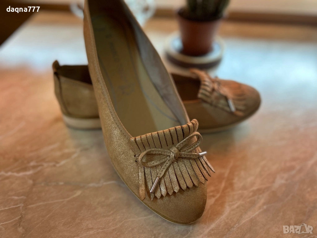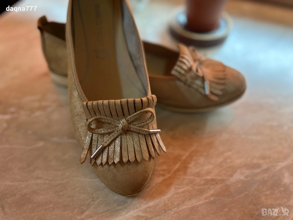 Дамски обувки тип балеринки / мокасини на марката Marco Tozzi. В пясъчнобежов цвят, изработени от велур и се отличават с декоративни ресни и малка панделка отпред.