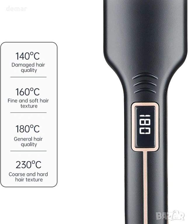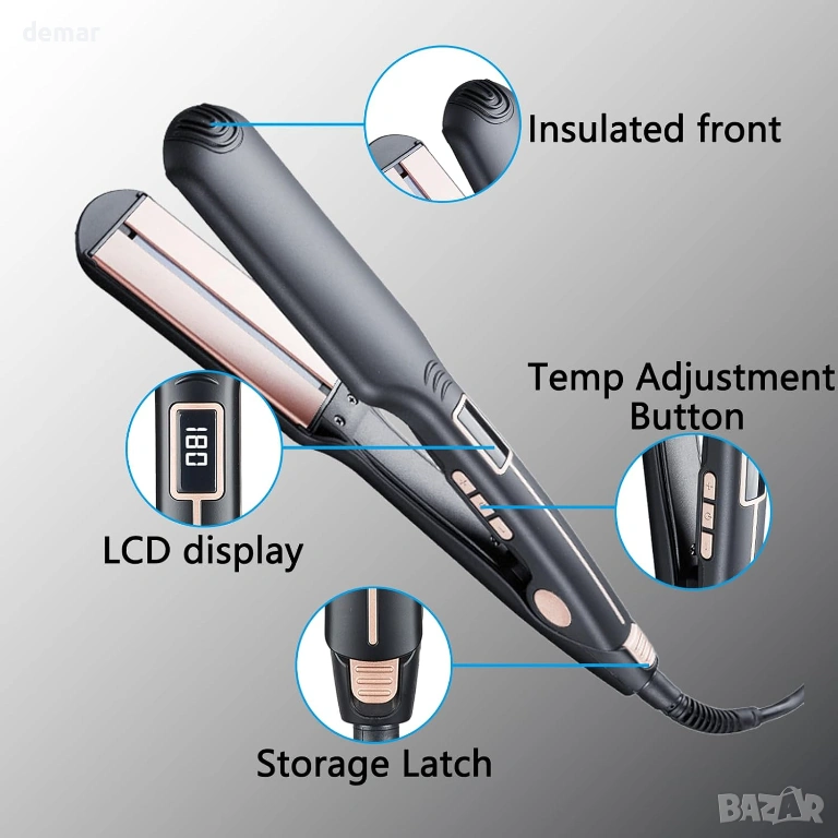 Инфрачервената и отрицателно-йонната технология работят заедно, за да намалят къдренето, да задържат влагата и да оставят косата по-гладка и блестяща, като същевременно минимизират увреждането от топлина. PTC нагревателната система осигурява бързо 30-секундно загряване с постоянна, контролирана топлина, подкрепена от керамично покрити плочи, които се плъзгат плавно, без да дърпат. LCD дисплеят предлага 14 регулируеми температурни настройки (100°C–230°C), подходящи за различни типове коса, позволяващи прецизен контрол на стилизирането. Безопасността и удобството са подобрени с 60-минутно автоматично изключване, въртящ се на 360° кабел за предотвратяване на заплитане и компактно заключване за лесно боравене и съхранение.
