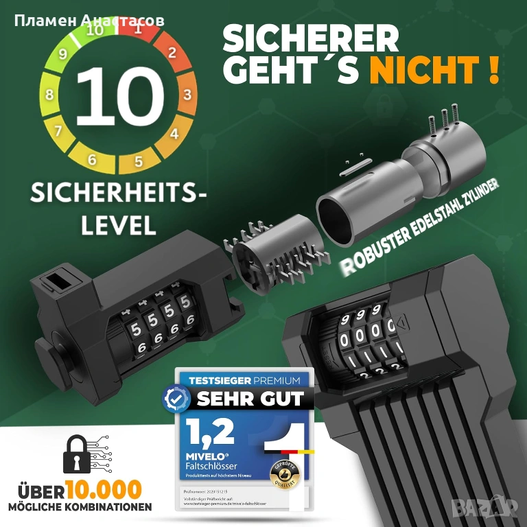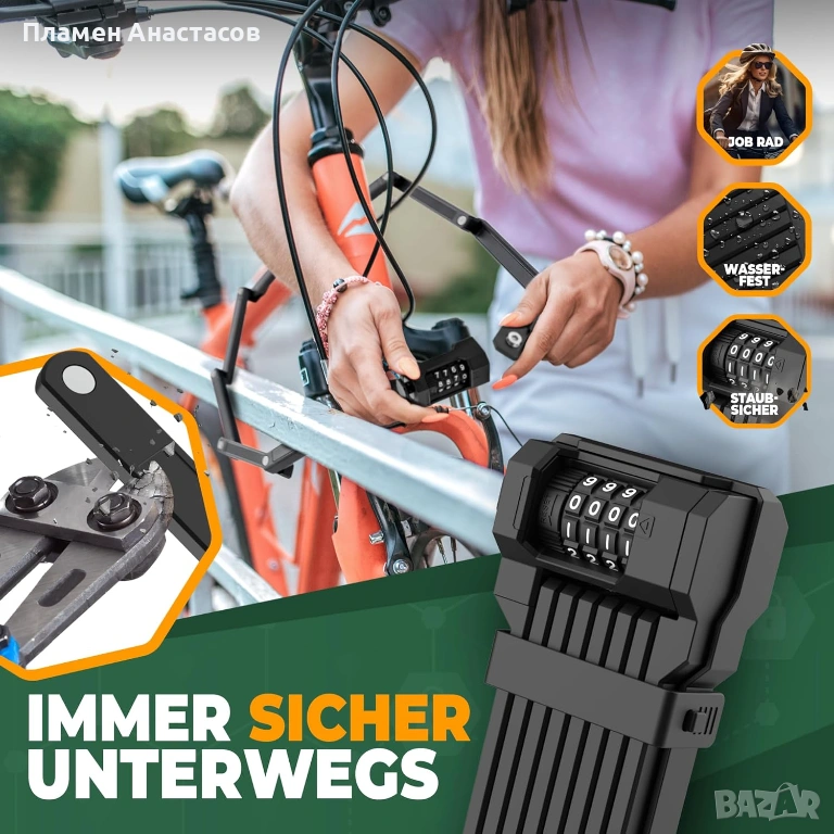 Моделът е с кодово заключване, което елиминира нуждата от ключове и позволява лесно задаване на персонална комбинация. Сгъваемият дизайн позволява катинарът да се прибира компактно, а включената стойка (bracket) осигурява удобно закрепване към рамката на велосипеда.