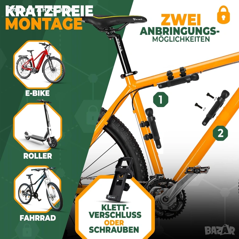 Катинарът използва здрави метални звена, свързани в сгъваема конструкция, която съчетава сигурността на U-lock с гъвкавостта на верига. Това го прави подходящ за различни видове велосипеди – електрически (e-bike), MTB и шосейни велосипеди.