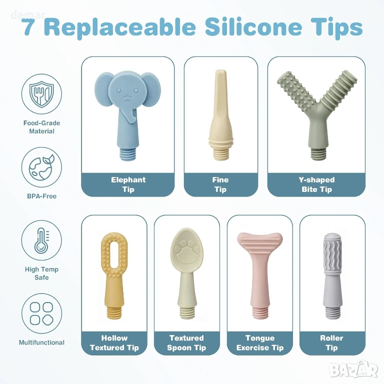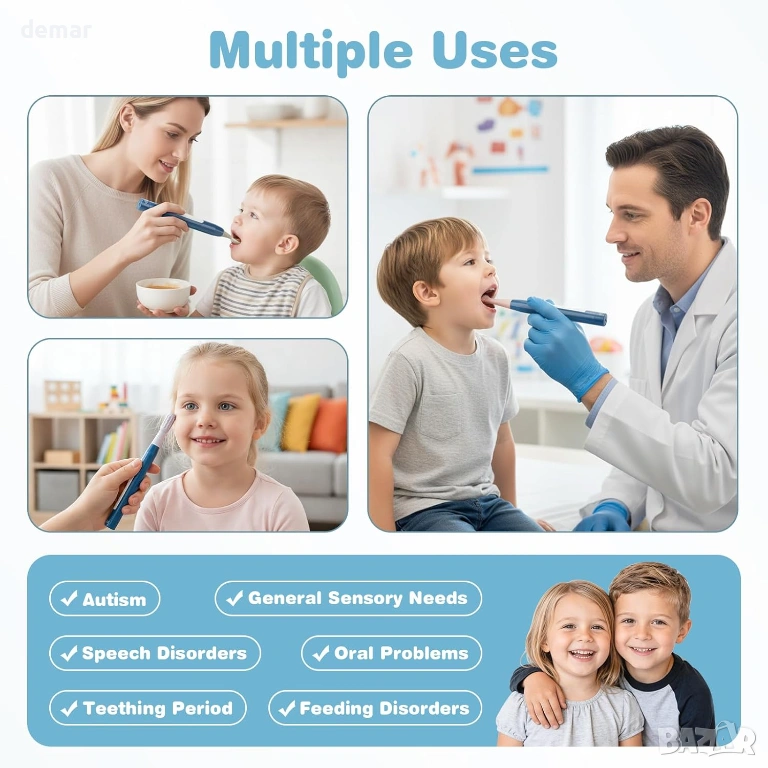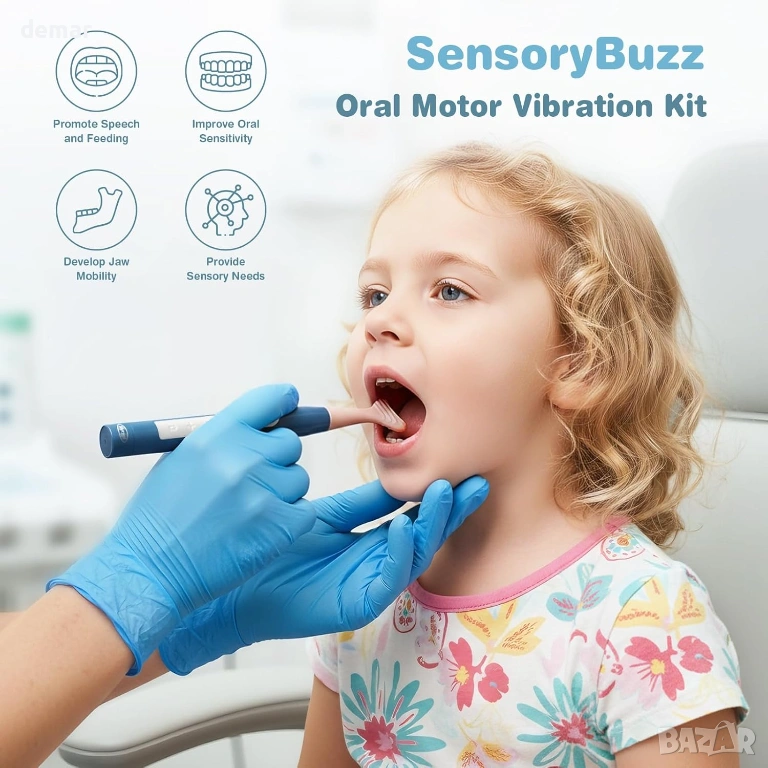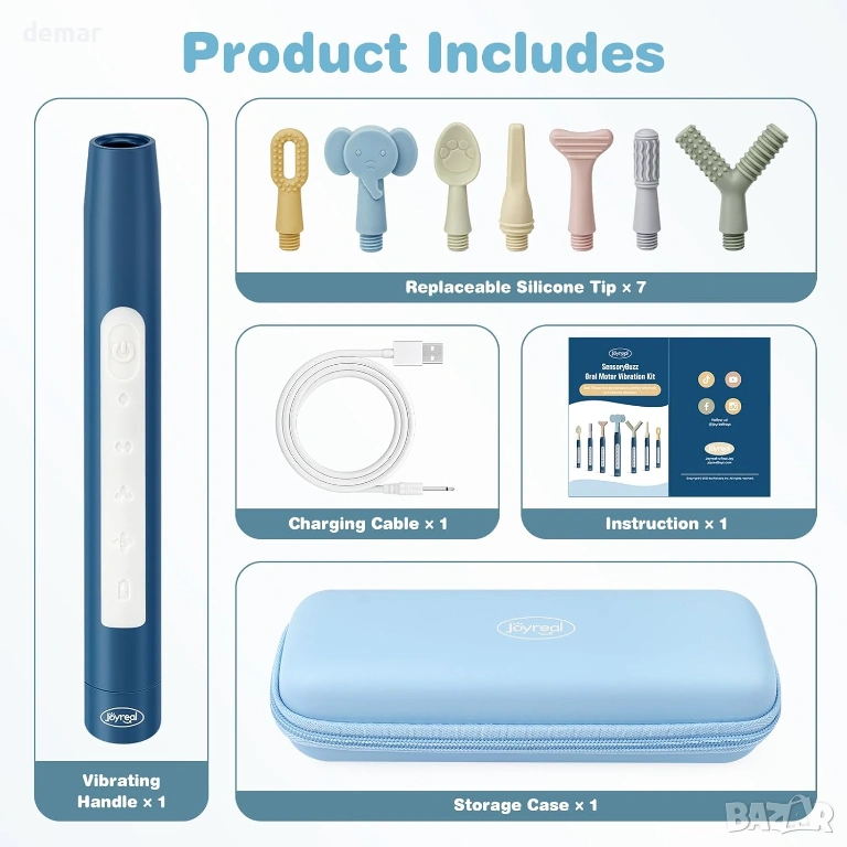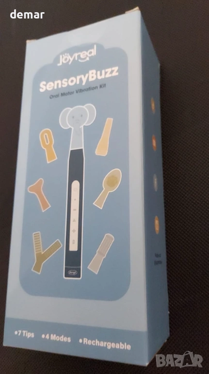 Пълен комплект за вибрации на оралната кухина, включващ презареждаща се дръжка с LED индикатор за батерията, седем сменяеми текстурирани силиконови глави за целенасочена стимулация на езика, венците, челюстта и бузите, както и четири регулируеми режима на вибрация, подходящи за различни нива на комфорт и етапи на развитие. Проектиран да поддържа сензорната интеграция, да намалява оралната чувствителност и да подобрява мускулната активация за по-ясна реч и увереност при хранене. Изработен от хигиеничен силикон, подходящ за почистване при висока температура, с преносим калъф за съхранение за удобна употреба у дома, в училище или по време на терапия.