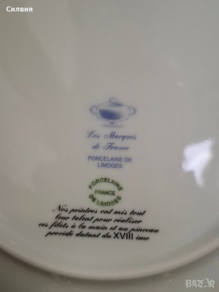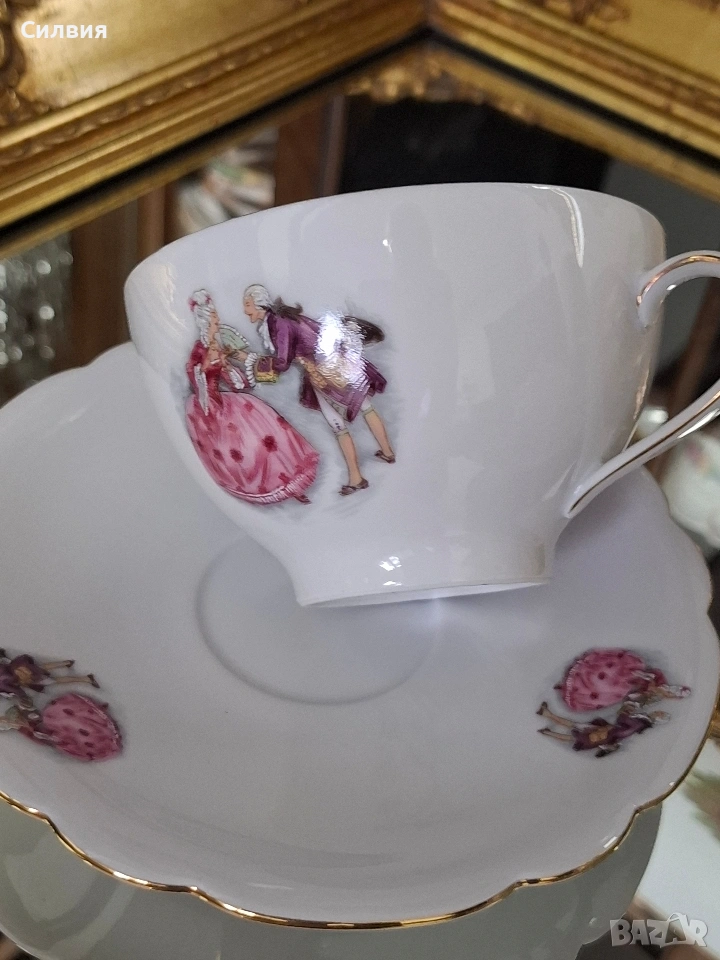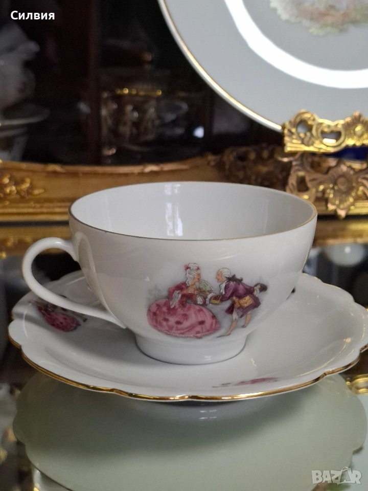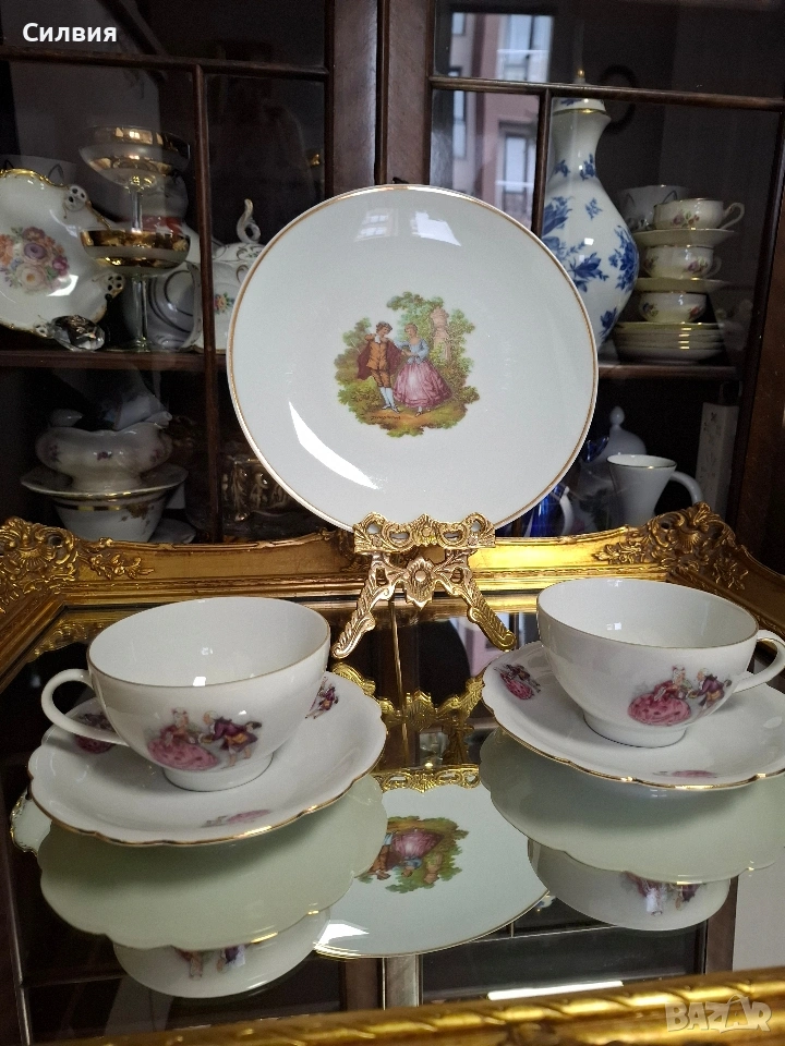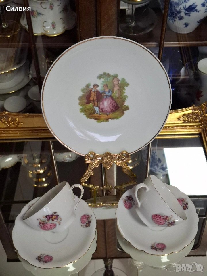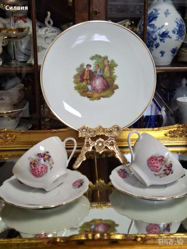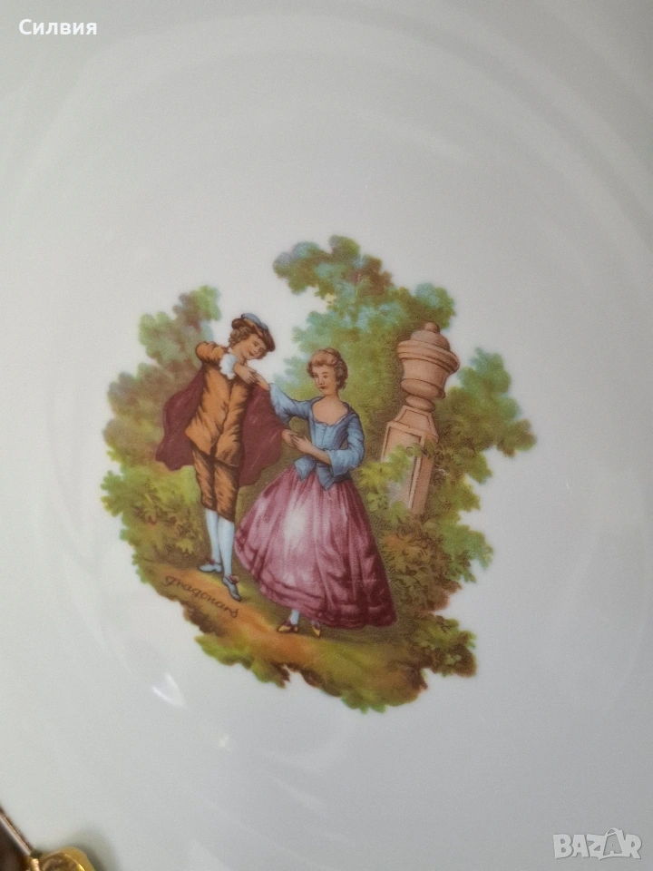 Романтичен Винтидж Комплект „Галантна епоха“ Чаши Seltmann Weiden & Плато Limoges „Тет-а-тет“ комплект за ценители, който пренася атмосферата на 18-ти век директно във вашия дом. Тази селекция съчетава майсторството на баварския порцелан с изяществото на френския Limoges, обединени от общ декор с романтични кралски сцени. ⚜️ Какво включва комплектът: 1) ●Две чаши с чинийки (Seltmann Weiden, Бавария) Тези произведения от фин бял порцелан носят духа на Западна Германия (W. Germany). Изобразяват нежни кавалери и дами в пищни рокли сред паркова среда. Детайли: Вълнообразен позлатен ръб и фини трансферни изображения. Размери: Диаметър на чашата 10,4 см, височина 6,4 см (вместимост 260 мл). Диаметър на чинийката: 16 см. Цена: 3️⃣8️⃣€ (74,33лв.) 2) ●Голяма чиния за сервиране (Limoges, Франция) Перфектното допълнение към чашите. Маркировката „Маркизите на Франция“ гарантира автентичен лиможки порцелан, създаден с техника, датираща от 18-ти век. Идеална за десерти, сандвичи или като декоративно плато. Размери: Диаметър 24 см. Цена: 2️⃣3️⃣€ (44,98 лв.) ⚜️ Защо да изберете този комплект? Антикварна стойност: Комбинация от световноизвестни марки с историческо значение. Състояние: Отлично винтидж състояние, съхранило блясъка на порцелана през годините. Всяка глътка чай или кафе от тези чаши е малко пътешествие във времето. Подарете си този къс от една красива и романтична история! Чинията има мин следи,които се виждат само погледната при определен ъгъл на светлината. Обща цена за целия сет: 5️⃣9️⃣€ (115,39 лв.) ღꕥ⊱❥─❥⊱💜✿⊱╮☆♪ ░L░o░V░e░❥─❥⊱💜✿⊱╮💜☆♪ღ💜ღ꧂ღ