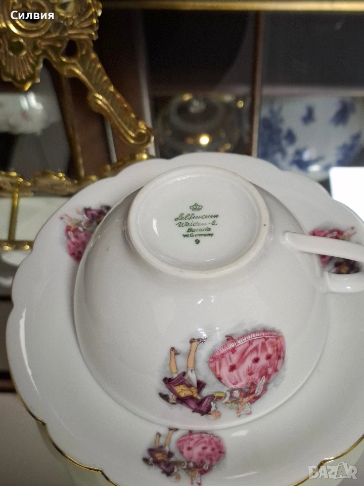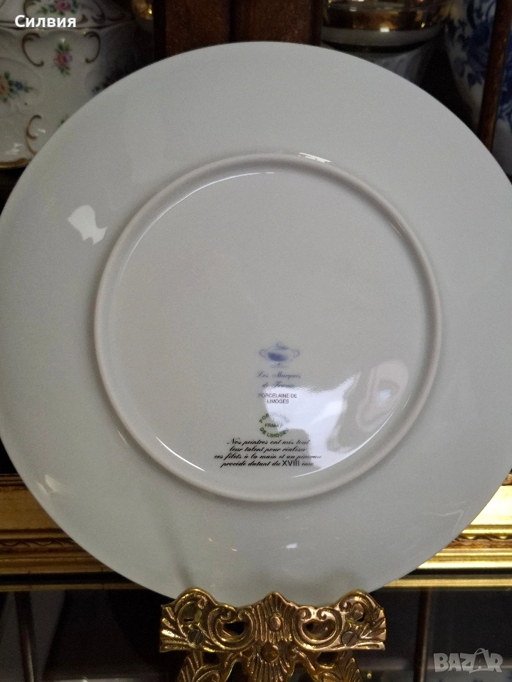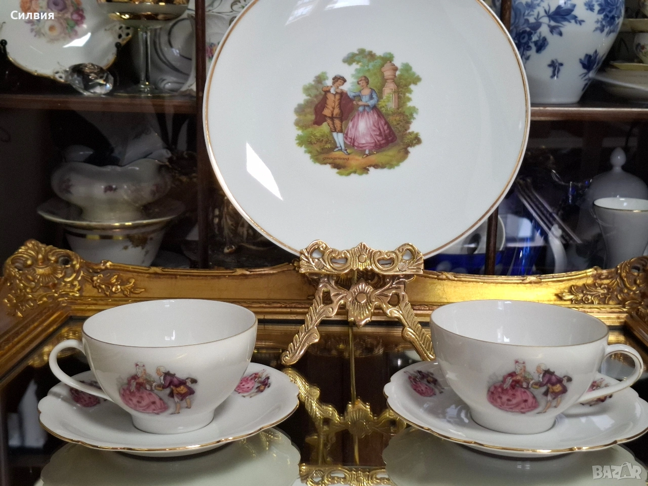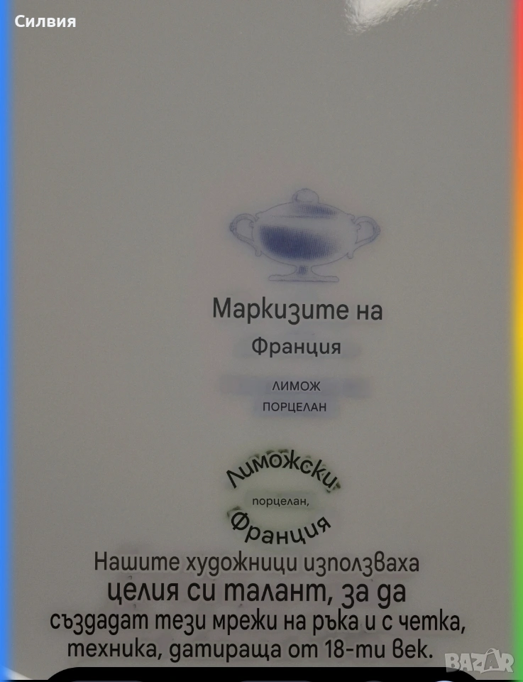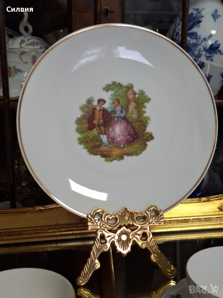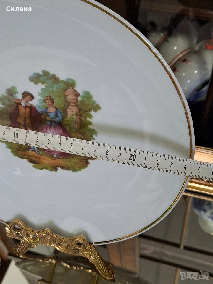 Романтичен Винтидж Комплект „Галантна епоха“ Чаши Seltmann Weiden & Плато Limoges „Тет-а-тет“ комплект за ценители, който пренася атмосферата на 18-ти век директно във вашия дом. Тази селекция съчетава майсторството на баварския порцелан с изяществото на френския Limoges, обединени от общ декор с романтични кралски сцени. ⚜️ Какво включва комплектът: 1) ●Две чаши с чинийки (Seltmann Weiden, Бавария) Тези произведения от фин бял порцелан носят духа на Западна Германия (W. Germany). Изобразяват нежни кавалери и дами в пищни рокли сред паркова среда. Детайли: Вълнообразен позлатен ръб и фини трансферни изображения. Размери: Диаметър на чашата 10,4 см, височина 6,4 см (вместимост 260 мл). Диаметър на чинийката: 16 см. Цена: 3️⃣8️⃣€ (74,33лв.) 2) ●Голяма чиния за сервиране (Limoges, Франция) Перфектното допълнение към чашите. Маркировката „Маркизите на Франция“ гарантира автентичен лиможки порцелан, създаден с техника, датираща от 18-ти век. Идеална за десерти, сандвичи или като декоративно плато. Размери: Диаметър 24 см. Цена: 2️⃣3️⃣€ (44,98 лв.) ⚜️ Защо да изберете този комплект? Антикварна стойност: Комбинация от световноизвестни марки с историческо значение. Състояние: Отлично винтидж състояние, съхранило блясъка на порцелана през годините. Всяка глътка чай или кафе от тези чаши е малко пътешествие във времето. Подарете си този къс от една красива и романтична история! Чинията има мин следи,които се виждат само погледната при определен ъгъл на светлината. Обща цена за целия сет: 5️⃣9️⃣€ (115,39 лв.) ღꕥ⊱❥─❥⊱💜✿⊱╮☆♪ ░L░o░V░e░❥─❥⊱💜✿⊱╮💜☆♪ღ💜ღ꧂ღ