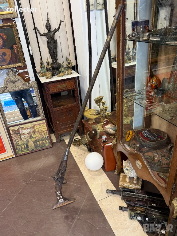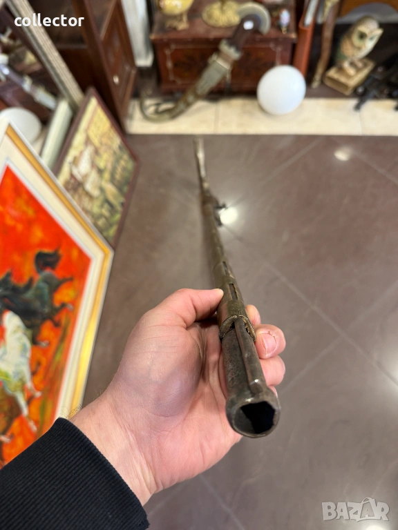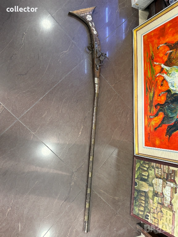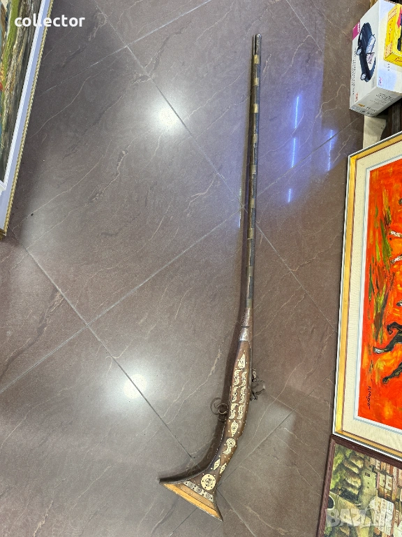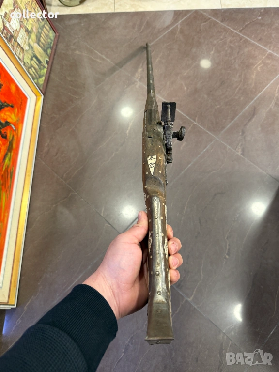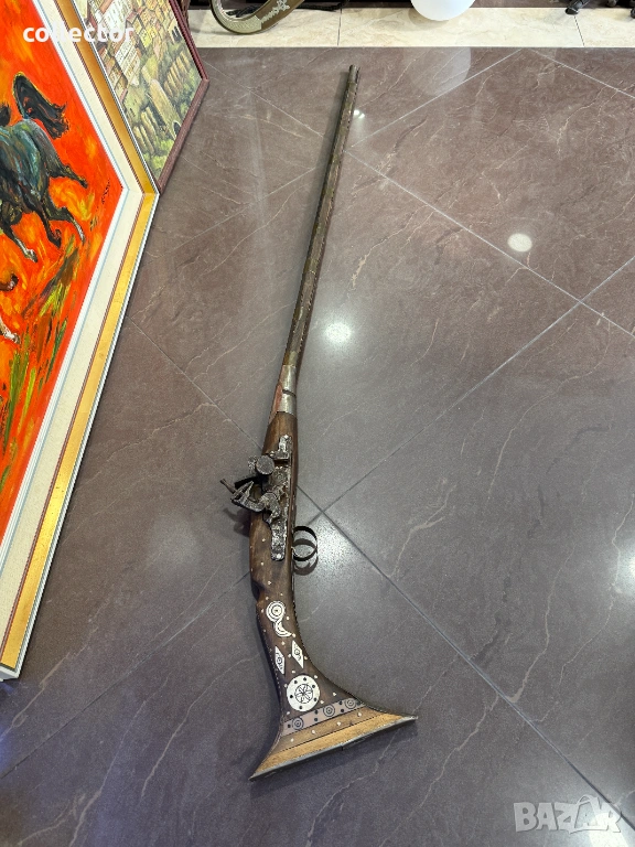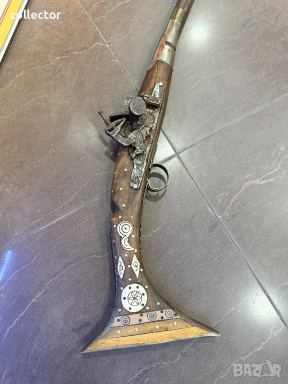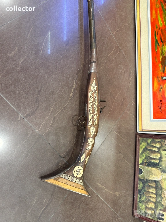 Стара кремъчна пушка с костни набивки, механизма НЕ работи. Състояние видно от снимките.