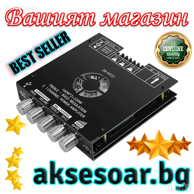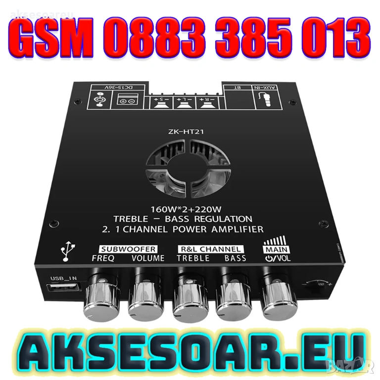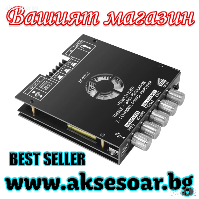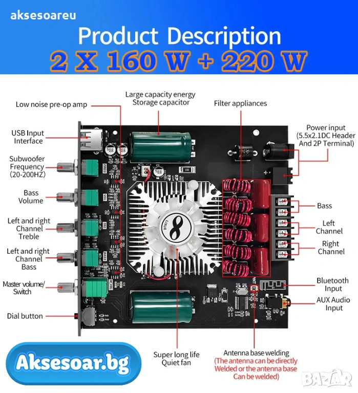 Усилвател 2 по 160 вата + буфер 220 вата HIFI стерео (Общо 540 W) на готова интегрална схема с Bluetooth 5.0 и потенциометри с 5 мм захранваща букса радиатор и вентилатор - цена 37.40 евро