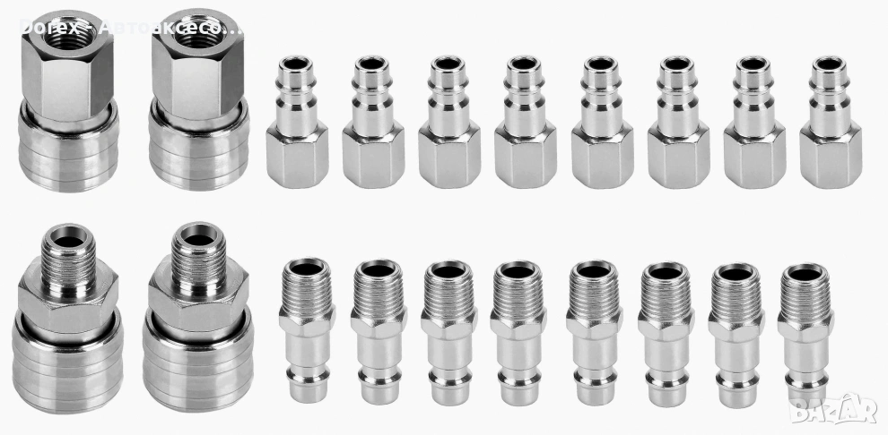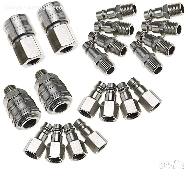 Комплектът включва 20 висококачествени пневматични накрайници за бърза и сигурна връзка между маркучи, компресори, машини и различни въздушни инструменти.