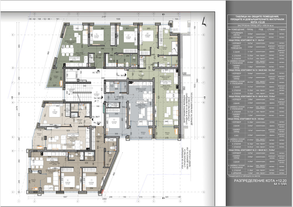 Общите части са изпълнени с гранит/гранитогрес, както и силикатна мозаечна мазилка.