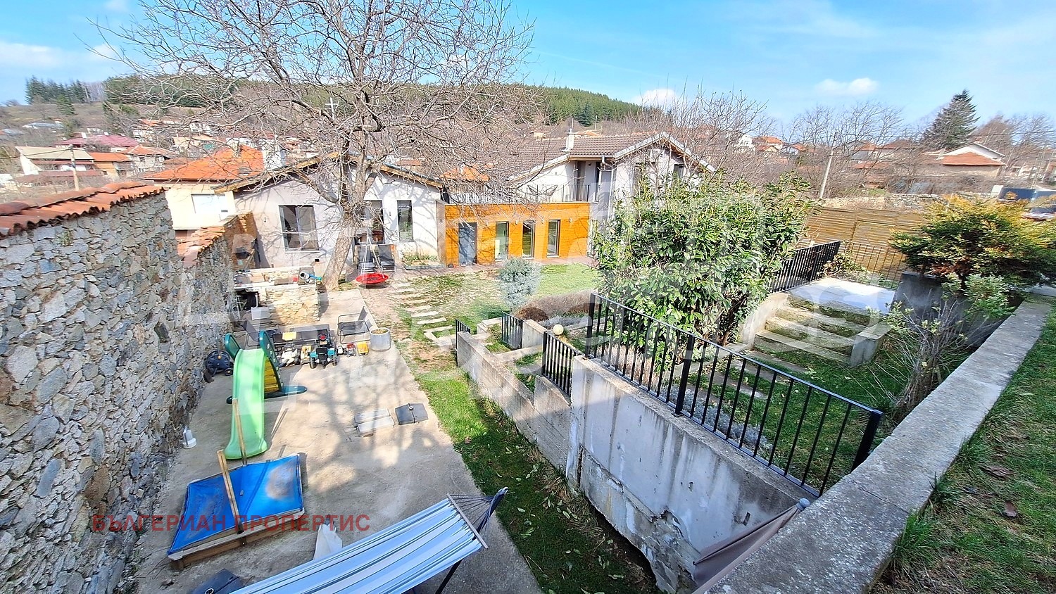 Дворът е просторен, ограден, терасиран и отлично поддържан, с обособени зони за отдих, барбекю и детска площадка. Композитният декинг около къщата допринася за модерния облик и практичност.