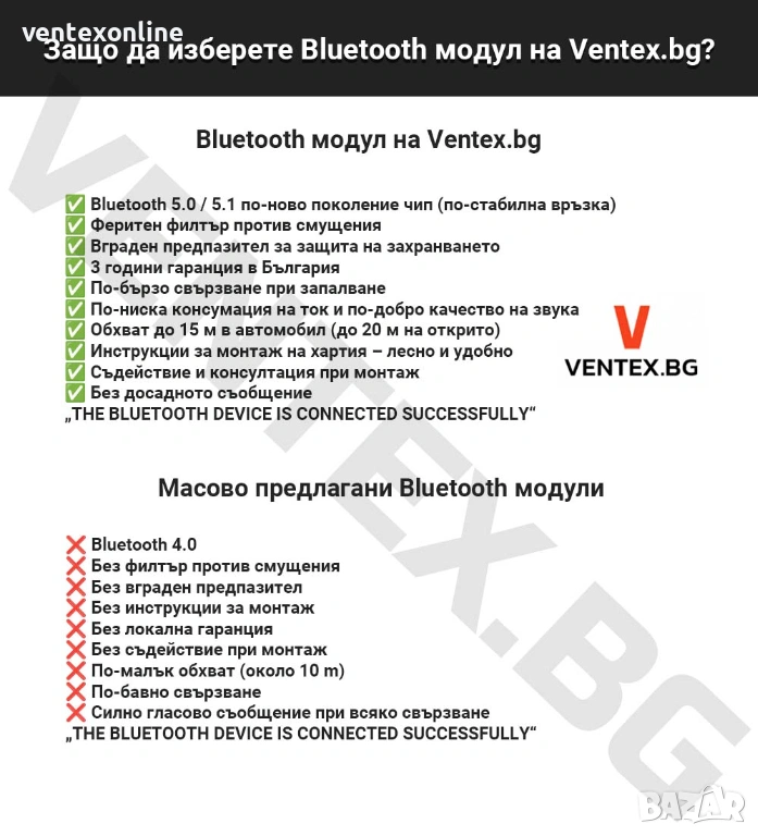 Ние от Ventex.bg през годините и с опита, който имаме, сме тествали стотици различни Bluetooth модули, докато стигнем до най-доброто решение за автомобилите на нашите клиенти.