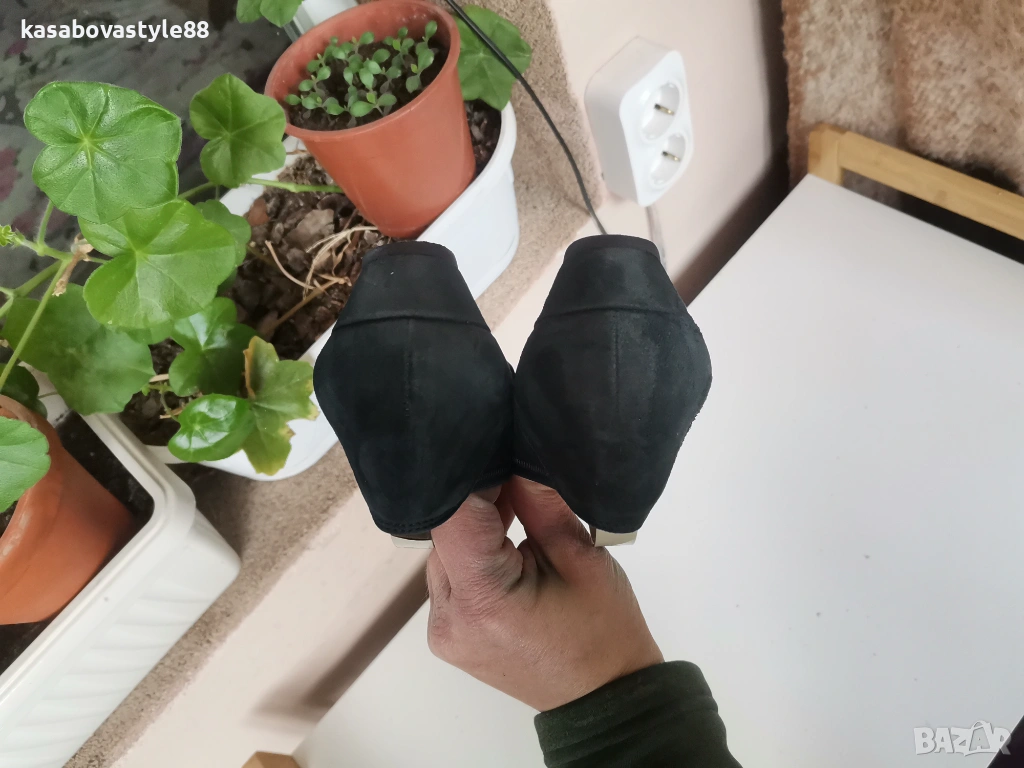 Балерините са в топ състояние!! Външната част е изработена от естествен велур в син цвят, а отвътре са изцяло от естествена кожа. Изключително комфортен модел, с еластично ходило и ултра мека стелка, предпазвайки стъпалата от натоварване. Дължина на стелка 25.5см.Ток 3см. Цялостна височина отзад 10см.