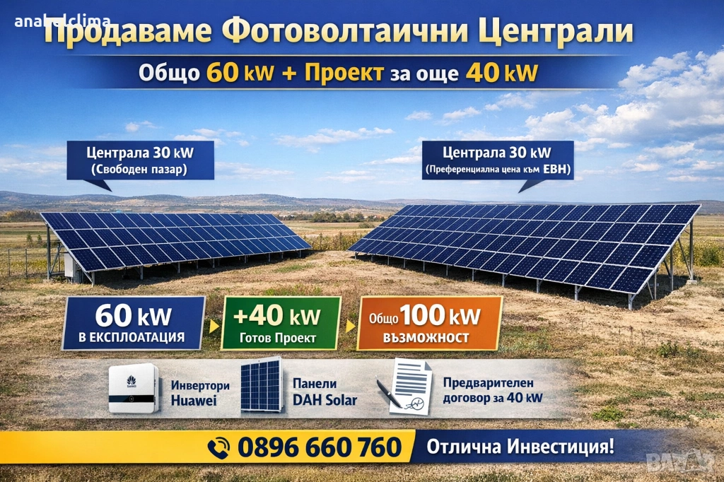 Продаваме 2 броя фотоволтаични централи по 30 kW всяка, разположени в един имот, с възможност за разширение до общо 100 kW.