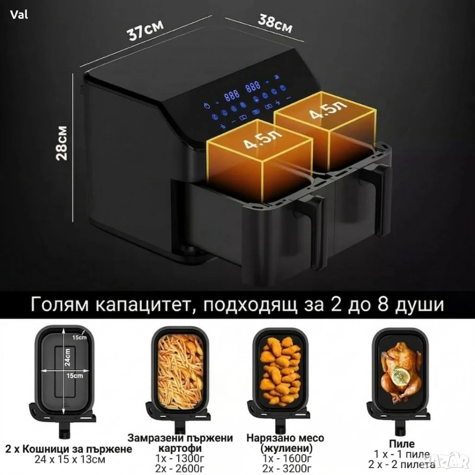 Капацитет: 9 л (2 x 4,5 л) Мощност: до 2000 W Температурен диапазон: 80°C – 200°C Таймер: до 60 минути Режими: 8 предварително зададени програми Управление: сензорен панел, LED дисплей Функции: Sync Finish, поддържане на топло, автоматично изключване, защита от прегряване Материали: незалепващо покритие, BPA free компоненти, подвижни филтри за лесно почистване