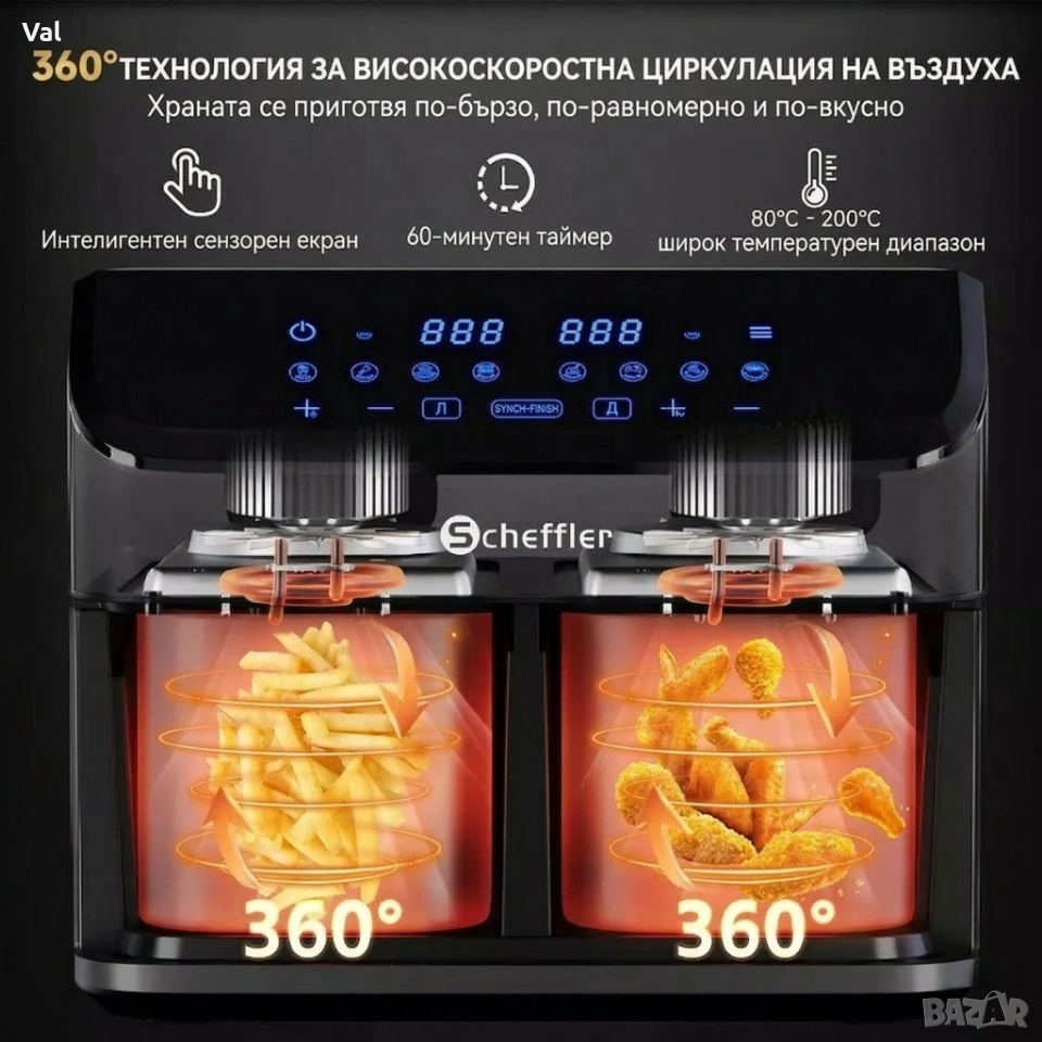 Фритюрник с горещ въздух XXL 9L, 2 камери, 8 програми, Двойно готвене & Синхронизиран финал