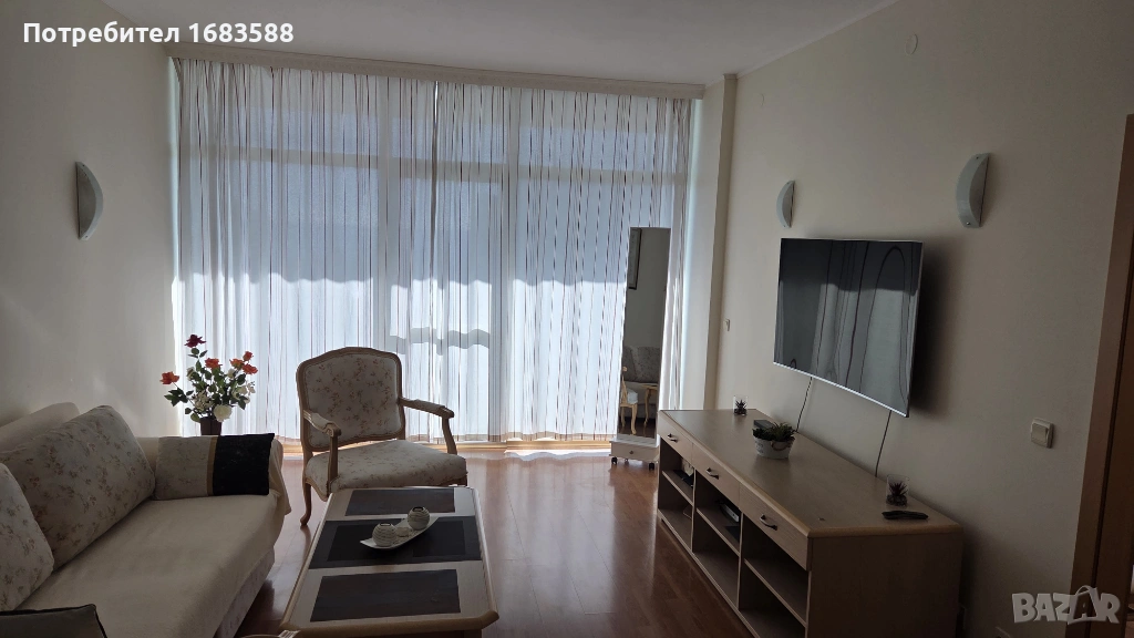 Апартаментът разполага с просторна всекидневна с трапезария и