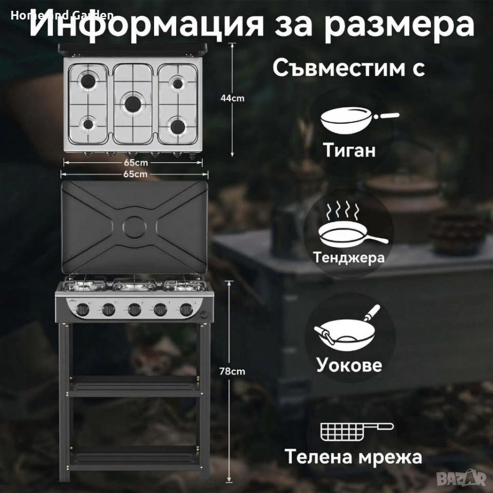 Газова печка HOMELUX с 5 котл9она и стелаж на два етажа, 7.2kW, неръждаема стомана → Обява 53901804