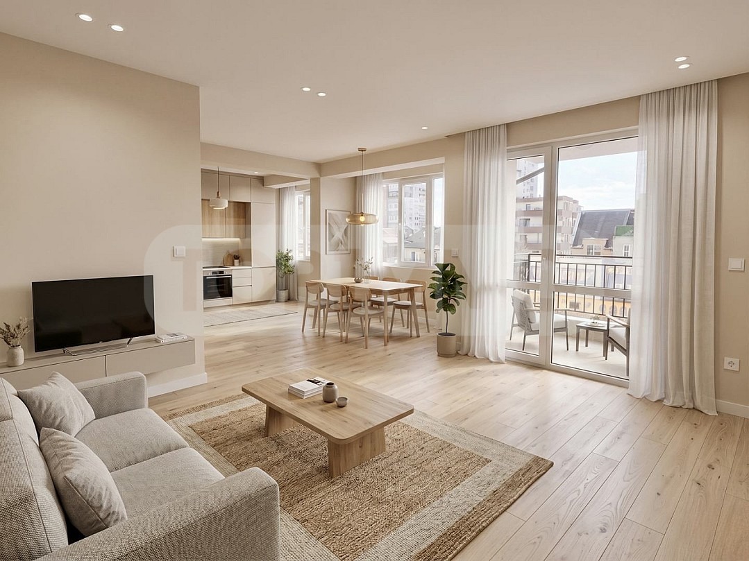 Апартаментът е разположен на четвърти етаж в пететажна сграда с асансьор. Състои се от голяма Г-образна дневна с кухненска част /31 кв.м./, 2 спални /съответно 14 кв.м. и 17 кв.м./, от които едната е преходна през дневната, баня с тоалетна /3,42 кв.м./, дрешник с прозорец /10.50 кв.м./, коридор /7.90 кв.м./, две тераси по /2.82 кв.м./ и избено помещение /8.84 кв.м./.