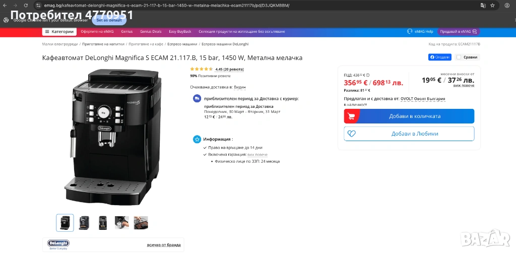 Кафеавтомат De'Longhi Magnifica S