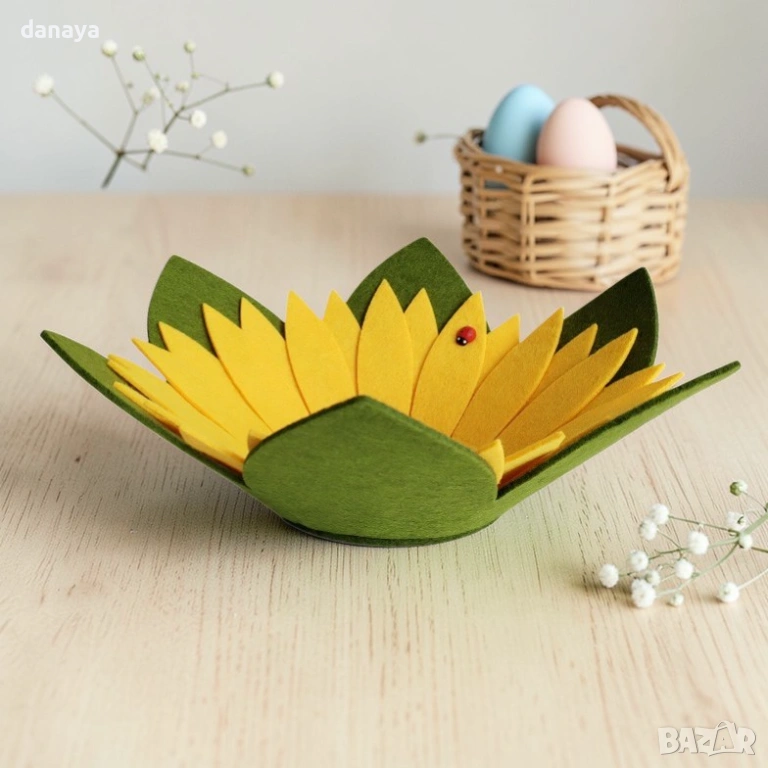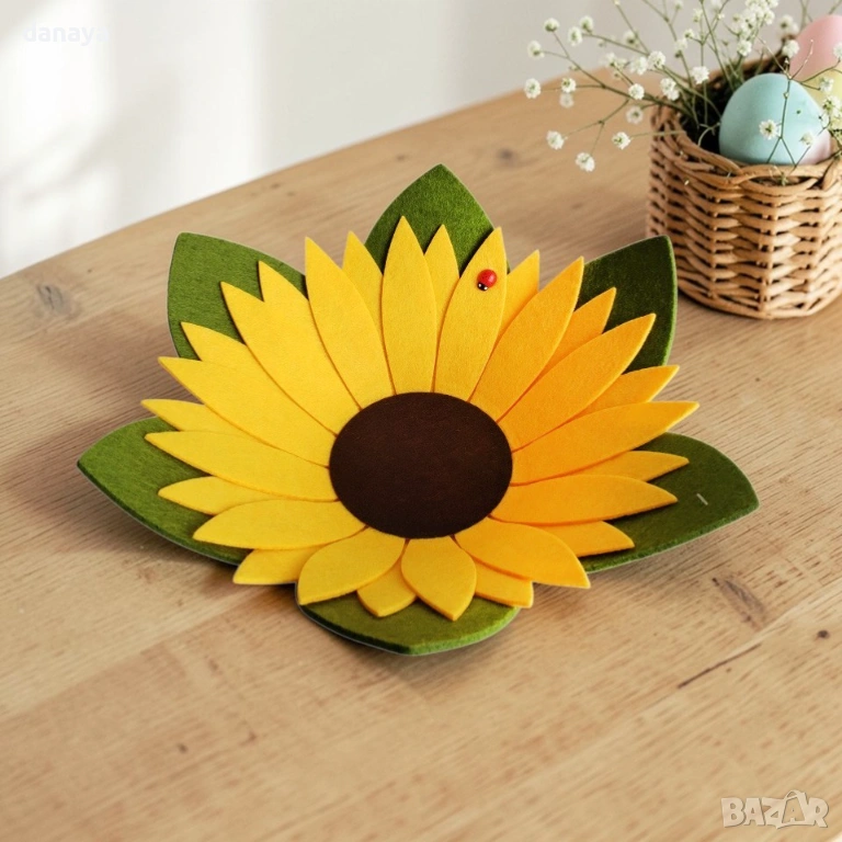 Тази великденска поставка слънчоглед за яйца и лакомства е практична и едновременно декоративна – идеална за подреждане на боядисани яйца, бонбони, сладки или малки изненади. Често търсена като украса за Великден и пролетна декорация за маса, тя съчетава функционалност и ефектна визия в едно.