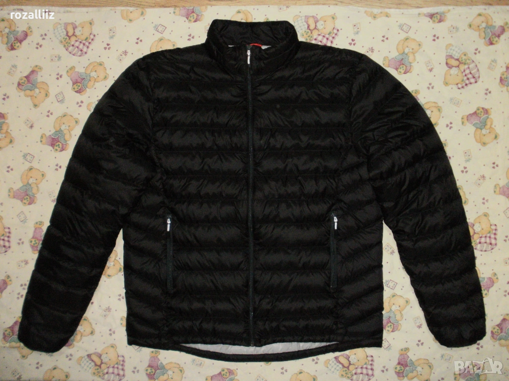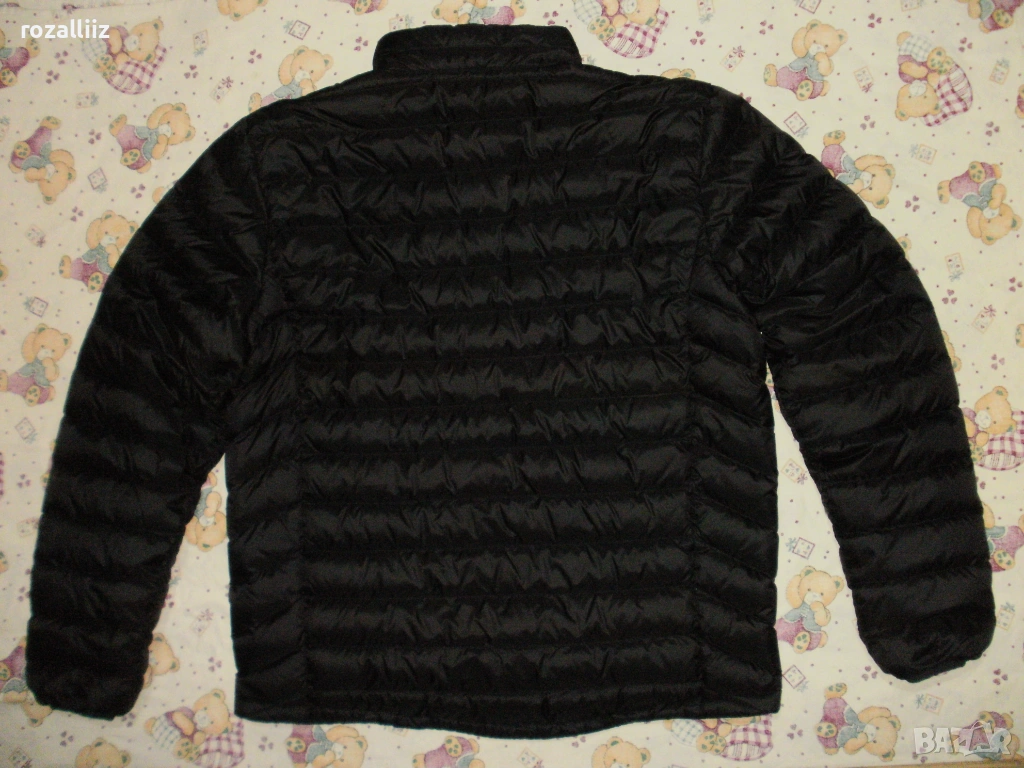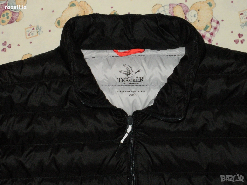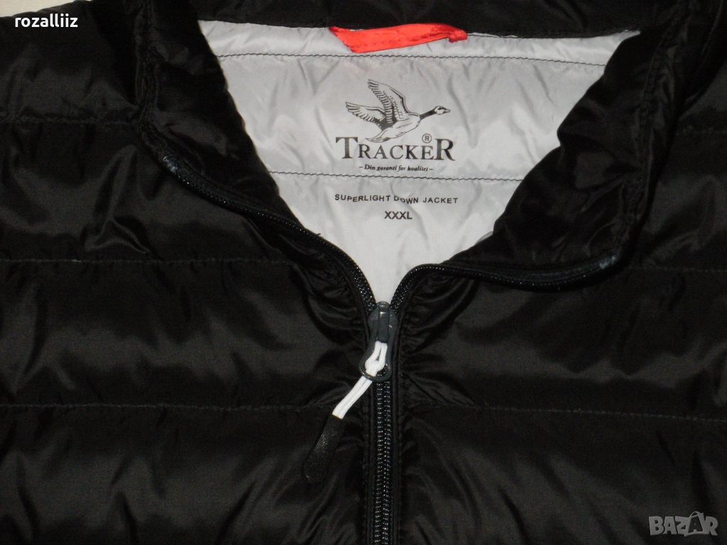 Якето е на TRACKER обличано без забележки неразличимо от ново. Модела е супер леки, пълнежа е 90%-гъши пух и 10%-пера. Закопчава се с цип, отпред има два джоба с ципове, и два вътрешни. Долу има ластик със стопери. Цвета е черно. Отпред е по късо. По номер е 3XL.