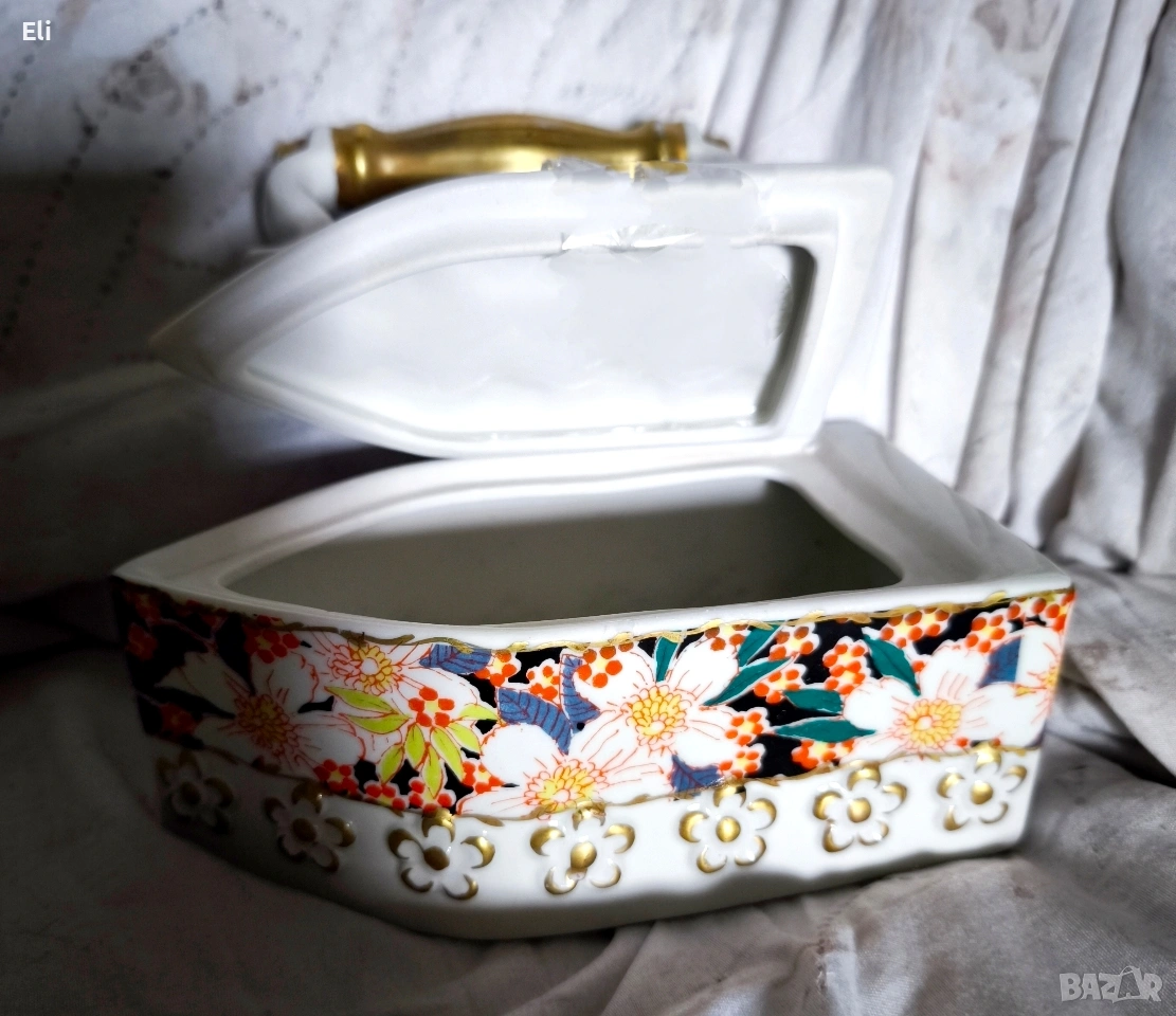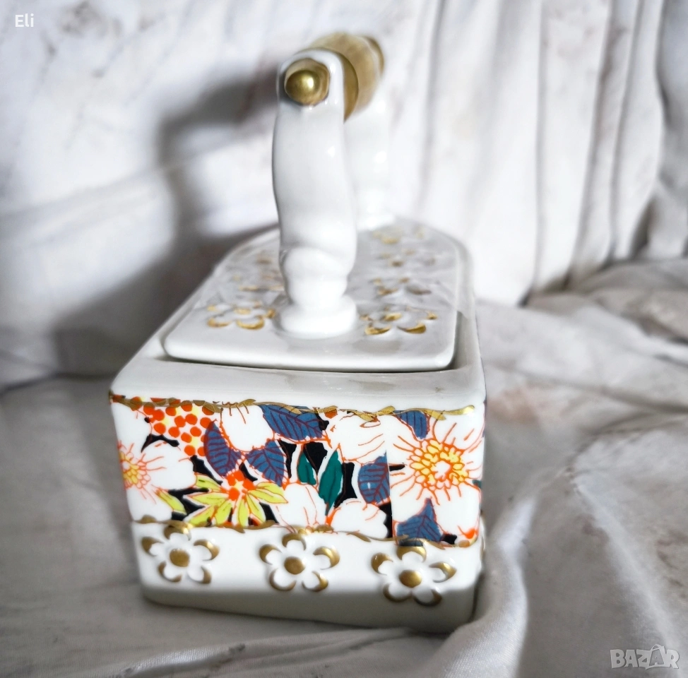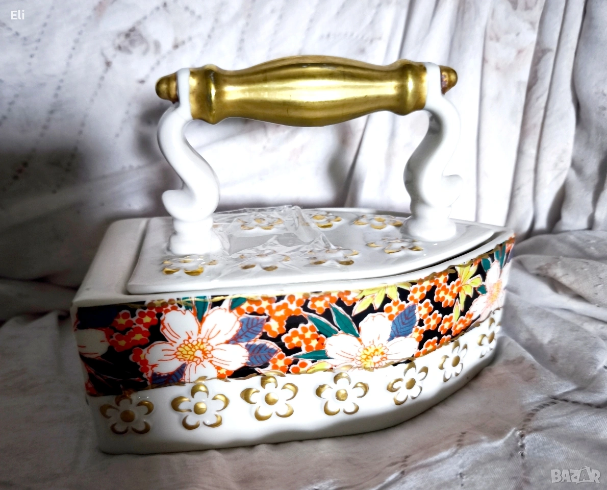 Декоративна порцеланова кутия или фигура, оформена като винтидж ютия, Порцелан с ръчно рисувани детайли. Дизайн: Флорални мотиви Декоративен предмет или малка кутийка за съхранение на дребни вещи. Размери 6/17/13 см Hispania Испания