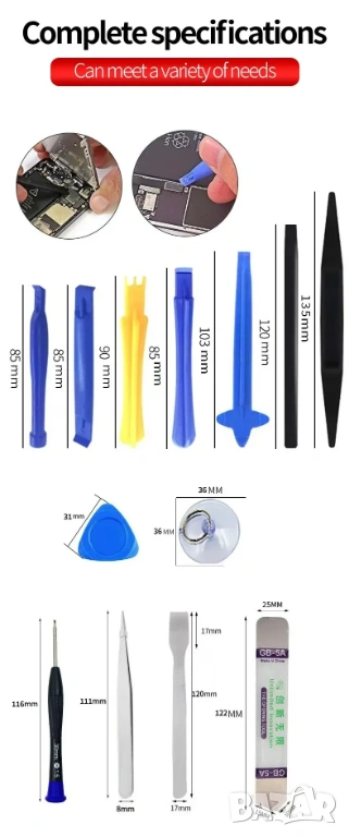 Всички инструменти са изработени от здрава стомана и пластмаса, което гарантира дълготрайност и надеждност при продължителна употреба. Този комплект е идеален както за професионални сервизни техници, така и за начинаещи и любители, които искат сами да се грижат за своите устройства.