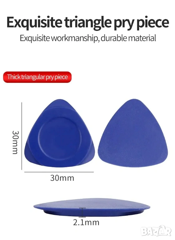 Различни пластмасови триъгълници и кирки за разделяне на компоненти.