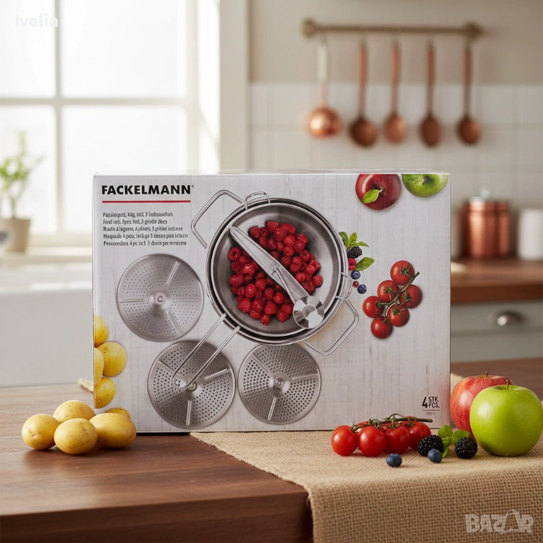 Материал: Неръждаема стомана за устойчивост на корозия и лесна хигиена.Диаметър: 19 см.Височина: 8 см.Ширина: 33 см.Дълбочина: 8 см.Комплект: 4 части, включващи купа, дръжка/лост и три различни сито-диска (фино, средно, по-едро). Точните размери и пробиви на дисковете са подбрани за балансиран поток и оптимално отделяне на семки и обелки. Подходяща за домашна и полупрофесионална употреба, лесна за почистване — препоръчва се пране ръчно или в горния съд на миялна машина в зависимост от упътванията.