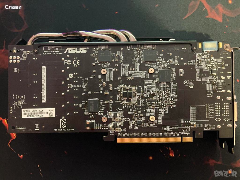 Видеокарта NVIDIA Asus GeForce GTX 660 2GB 192BIT GDDR5, PCI-EXPRESS, Dual DVI-D, DP, HDMI. Видеокартата е перфектна, почистена от прах, със сменена термоконтактна силиконова паста. Идеална за FHD игри, като Fortnite, Counter srike 2, CS GO, GTA V, PUBG, Valorant, League of legends, Apex legends, Need for speed. Картата е с допълнително захранване от един шест пинов конектор.