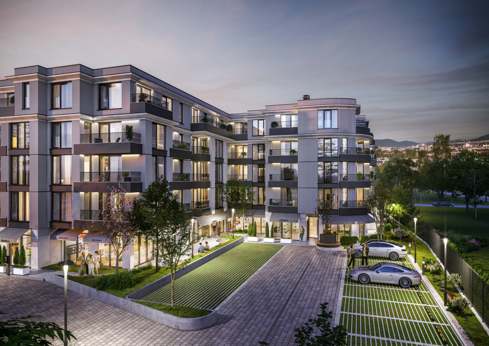 - Партерните търговски обекти са проектирани с висококачествена алуминиева дограма, осигуряваща модерна визия, отлична видимост и максимален достъп на естествена светлина.