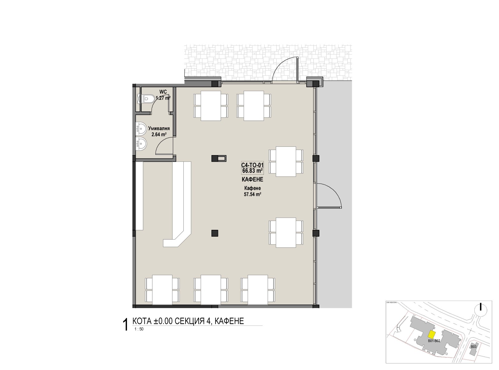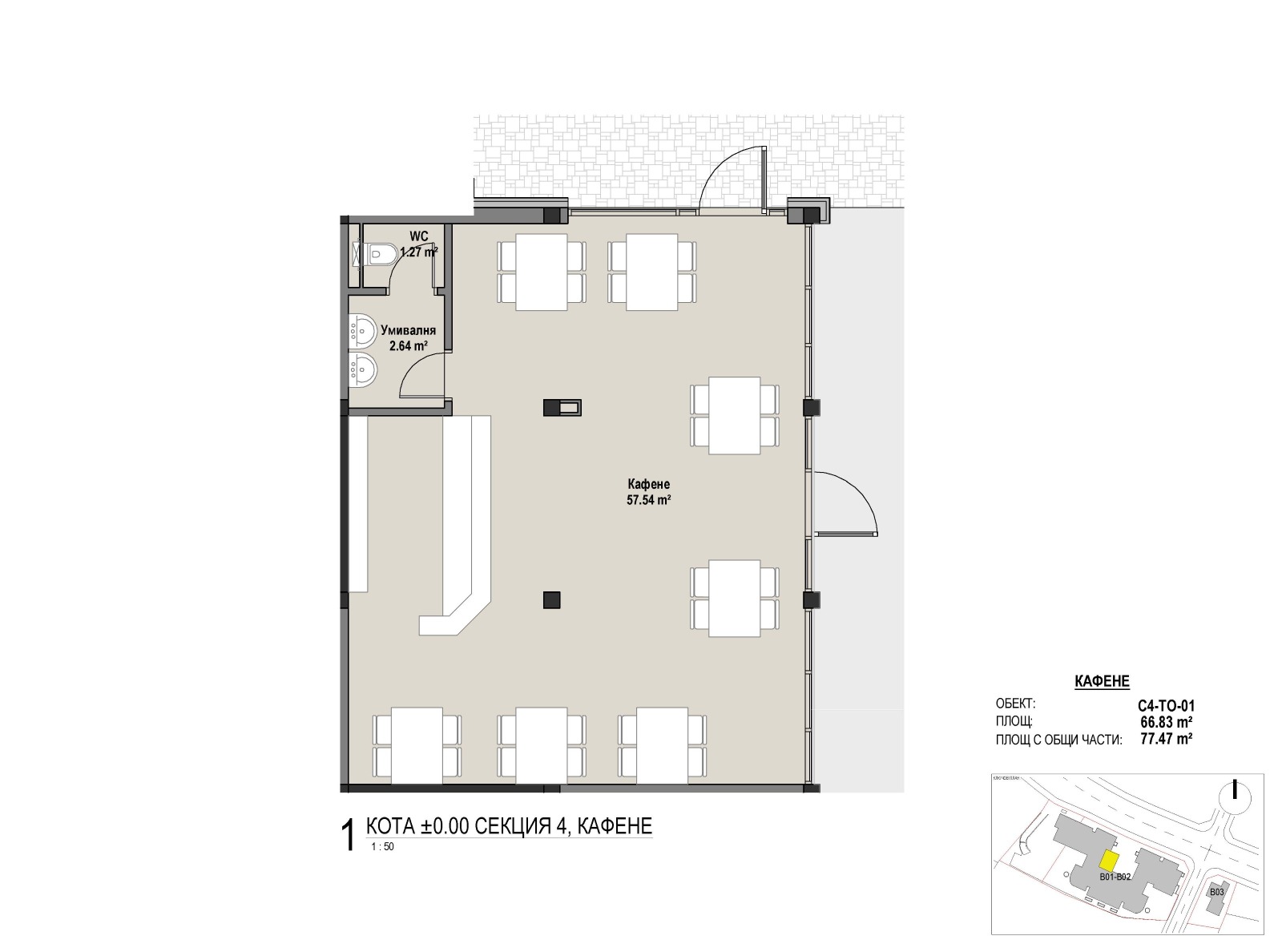 Кафене 66,83кв.м. застроена площ, 77,47кв.м. с общи части 387 350