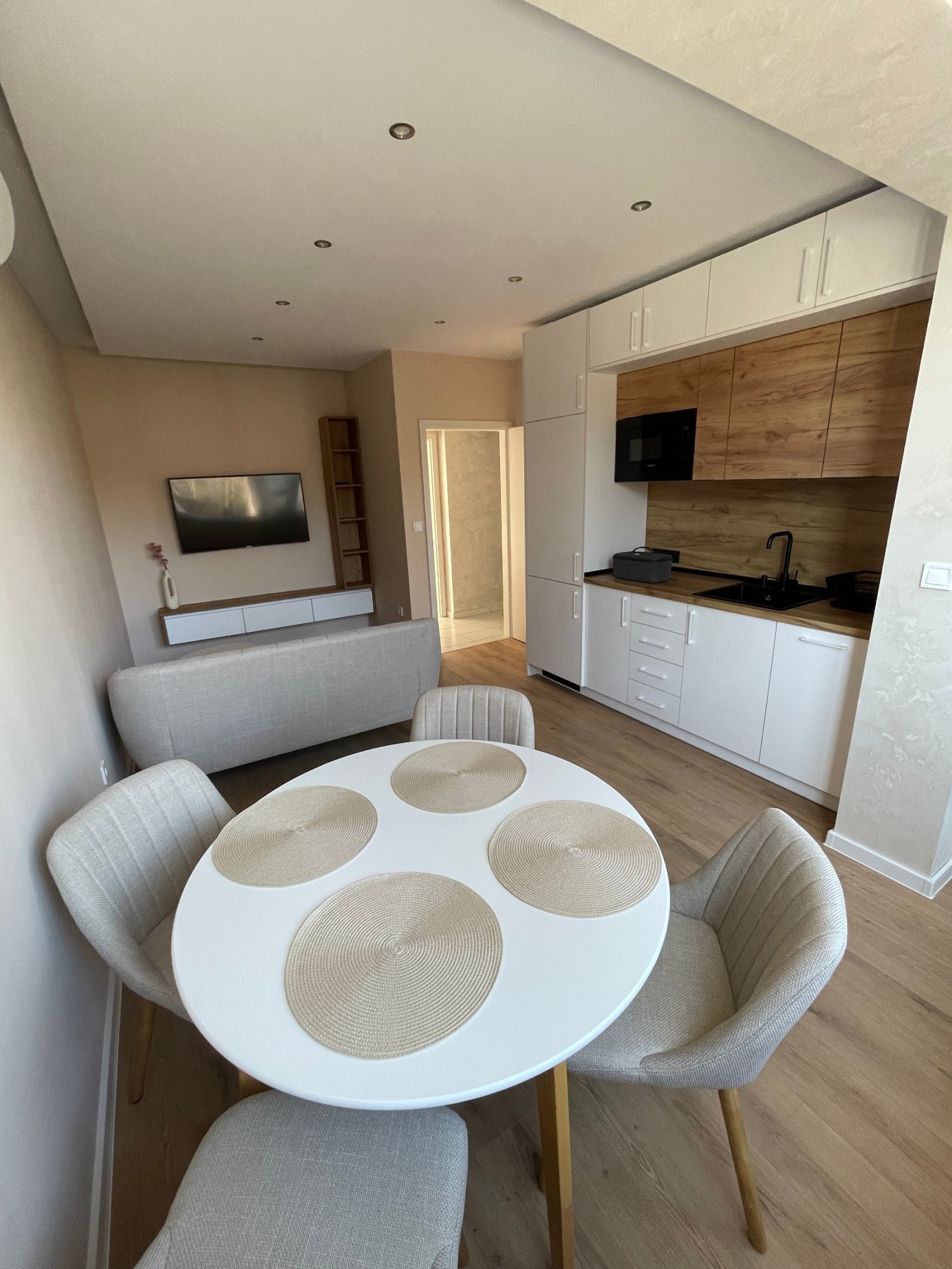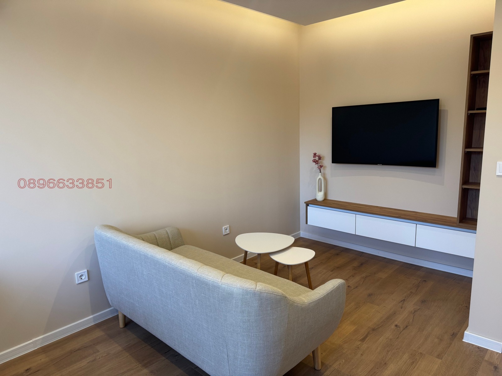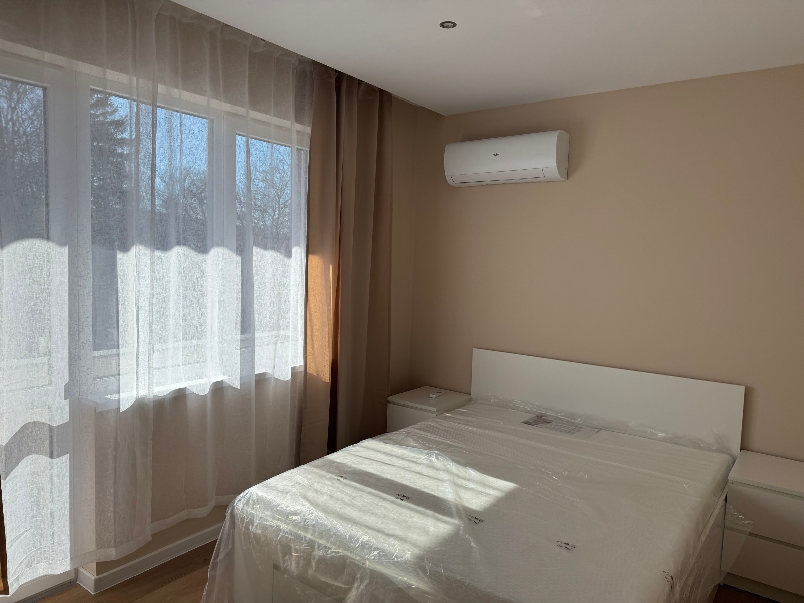 Апартаментът е съвременно обзаведен след цялостен основен ремонт и чака своите първи наематели. Оборудван е с всичко необходимо (абсорбатор, фурна, котлони, микровълнова, хладилник, съдомиялна, пералня със сушилня, бойлер, два климатика).