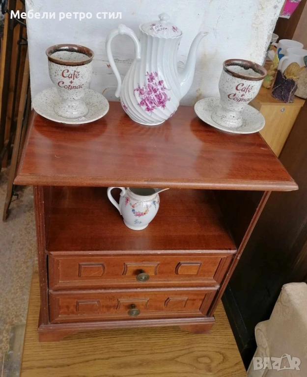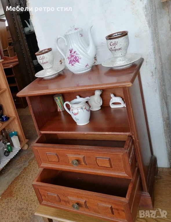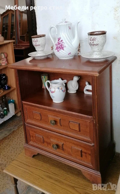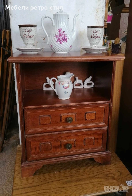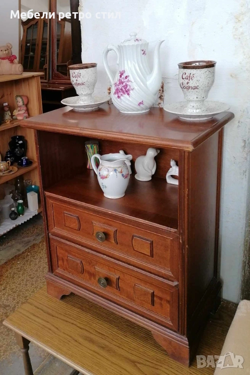 Стилно дървено шкафче от масивно дърво с две чекмеджета и отворена ниша. Подходящо за нощно шкафче, малък скрин, декорация във винтидж стил с компактни и удобни размери за всеки дом. Рзамери: 51см / 29см вис. - 60см. Цена 42€ / 82,14лв