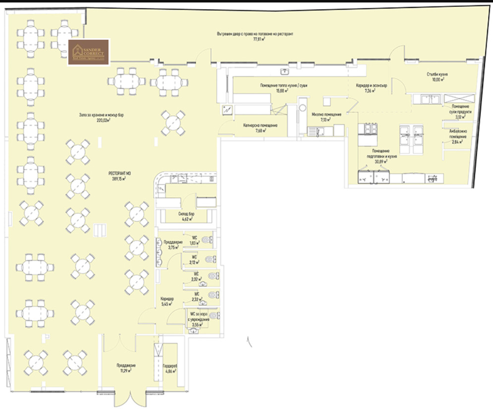 Ресторантът се намира по средата между двата входа на сградата и е с изложение юг/изток. Общата застроена площ е 465 м2. Има вътрешен двор от 77 кв.м с право на ползване за ресторант. Състои се от предверие, зала за хранене и мокър бар, бар, гардеробна, санитарни помещения, келнерско помещение, помещение за топла кухня, помещение за подготовка и други. Има кухненски асансьор. Изключителен район с голям човекопоток.