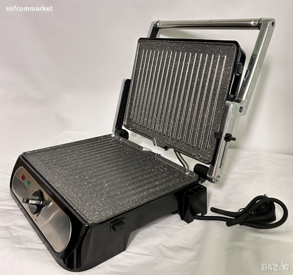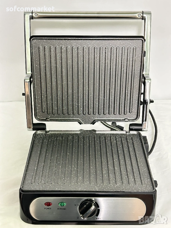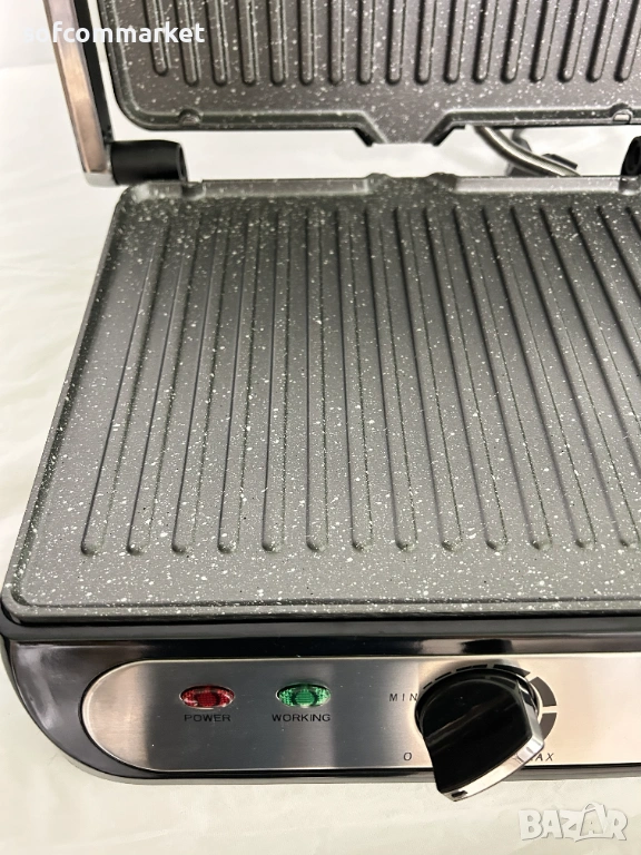 Гъвкавост на отваряне:Уредът може да се отваря на180°, като по този начин удвоява повърхността за печене и може да се използва като отворена скара.