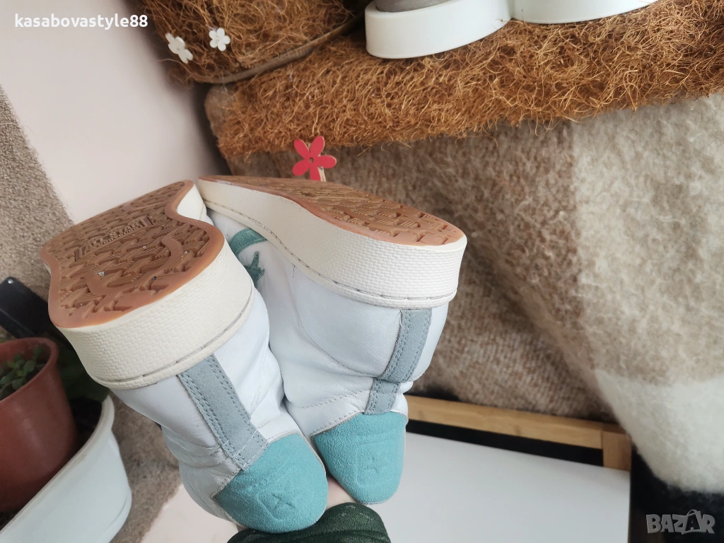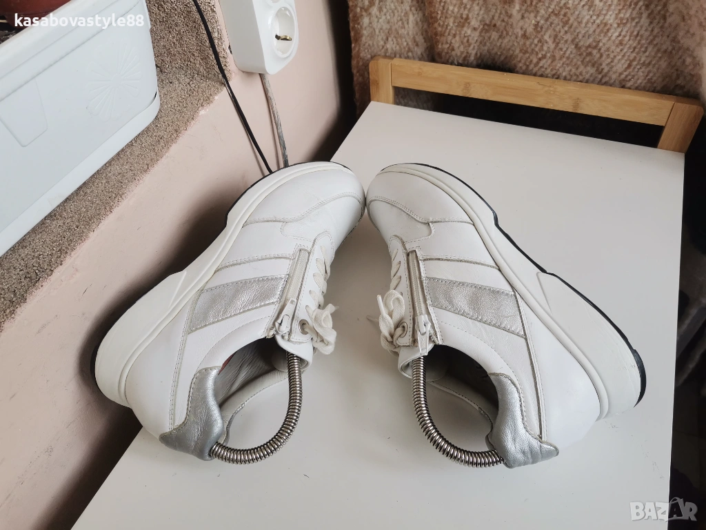Пролетно-есенни мъжки спортни обувки от бяла естествена кожа и сиви велурени детайли около връзките. Перфектно запазени, без забележки. Отвътре са с foam стелка за по-добро омекотяване при носене. Вътрешността е от текстил. Моделът е с олекотено и гъвкаво ходило, което в горната си част е шито за повече здравина. Вис. 3см.Цялостна височина отзад14.5см.По етикет се водят 43 н но отговарят на 42 н. Дължина на стелка 27.6см.