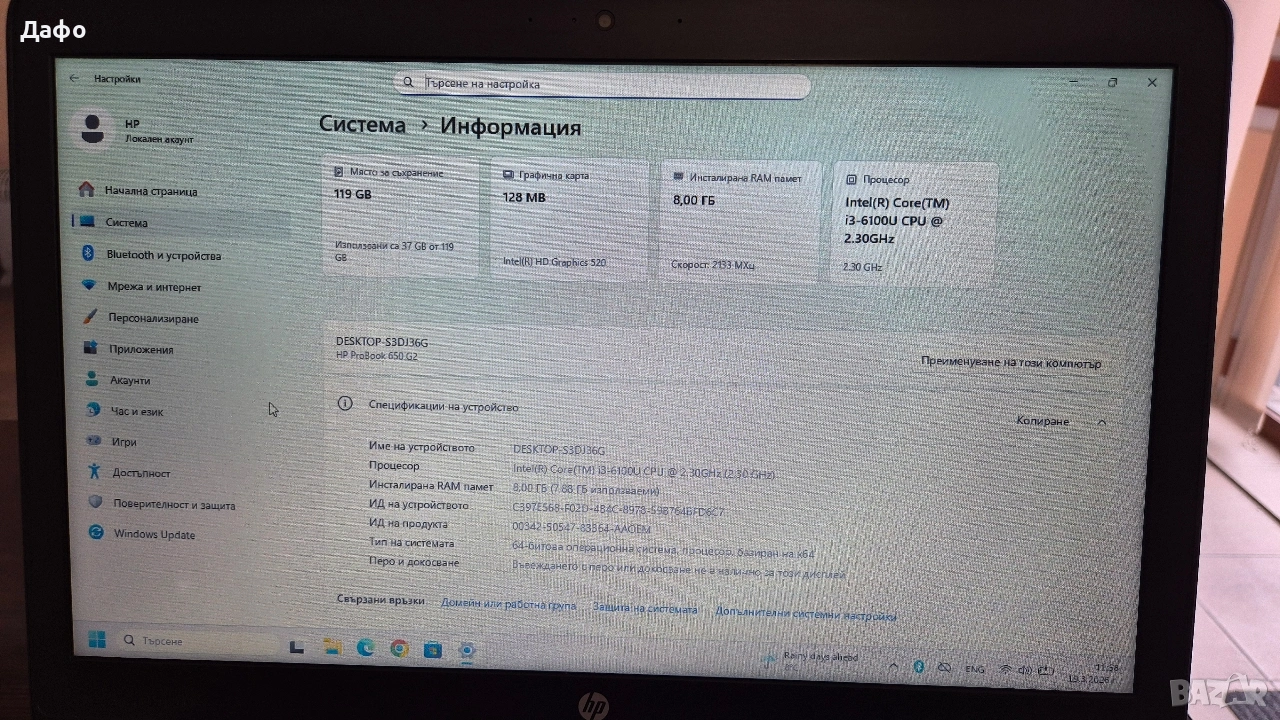 Лаптопът е много запазен. Има инсталиран Windows 11 като се активира автоматично, заради лецензния ключ. Оригинално зарядно. Липсва батерия, защото е развалена. Параметрите са: Intel Core i3-6100, 8GB DDR4 и 128GB SSD M2.2280. Само лично предаване за Пловдив и региона. Цена: 140 евро.