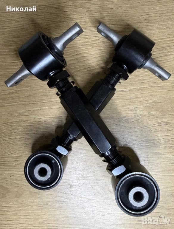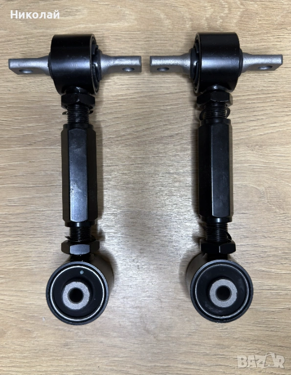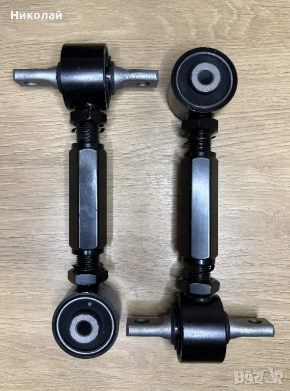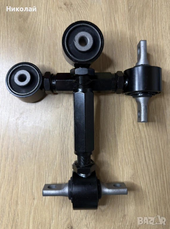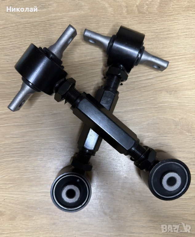 Продавам комплект регулируеми задни горни носачи за Honda (Хонда) CR-V (ЦРВ) 1, позволяващи прецизен реглаж на задния мост. За разлика от оригиналните твърди носачи, тези дават възможност за настройка на наклона (camber) на задните колела.