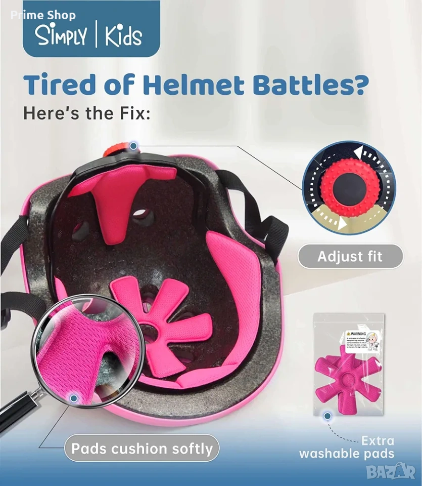 Тагове: детска каска, каска за велосипед, каска за колело, каска за тротинетка, Simply Kids, размер M, предпазна екипировка, детска защита, розова каска, каска със стикери, ABS каска, EPS пяна