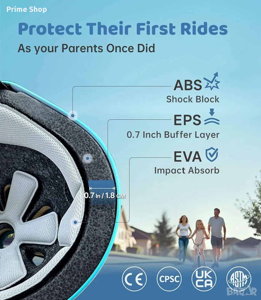 * Сертификати за безопасност: CE, CPSC 1203, ASTM 1447, EN 1078, UK CA