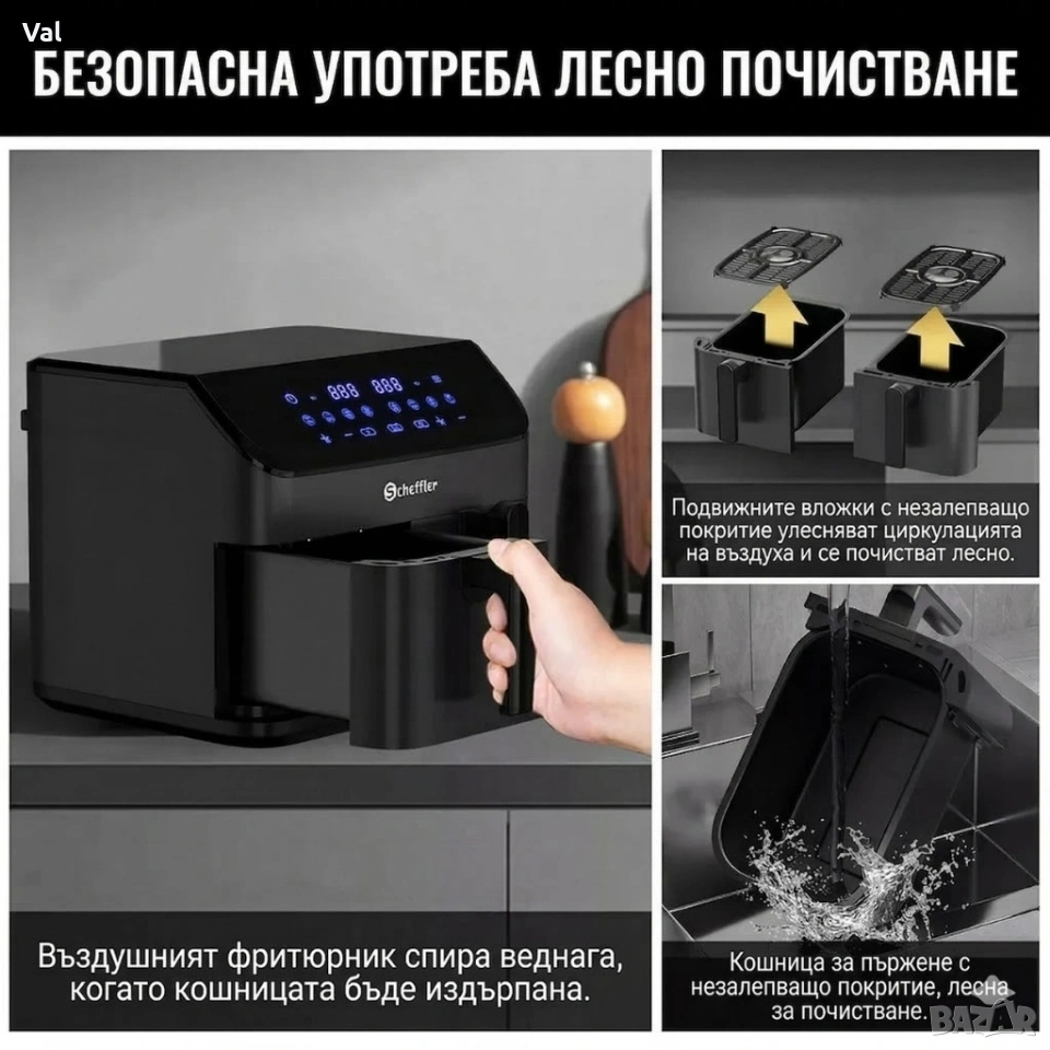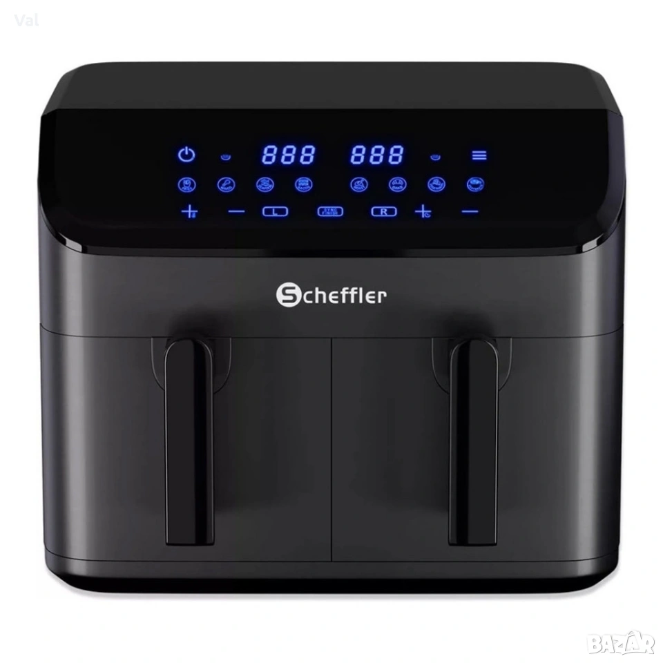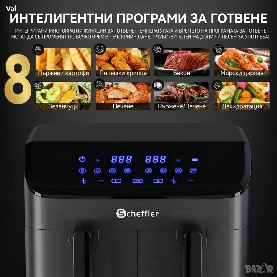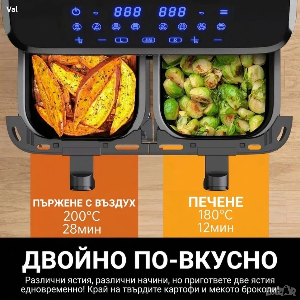 Фритюрник с горещ въздух XXL 9L, 2 камери, 8 програми, Двойно готвене & Синхронизиран финал