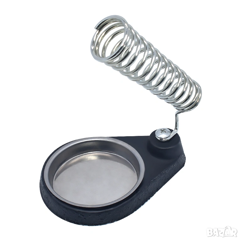 Изработена от здрав метал, стойката е устойчива на високи температури и осигурява дълготрайна употреба. Конструкцията със спираловиден държач позволява стабилно фиксиране на поялника, като същевременно държи върха далеч от повърхности и ръце.