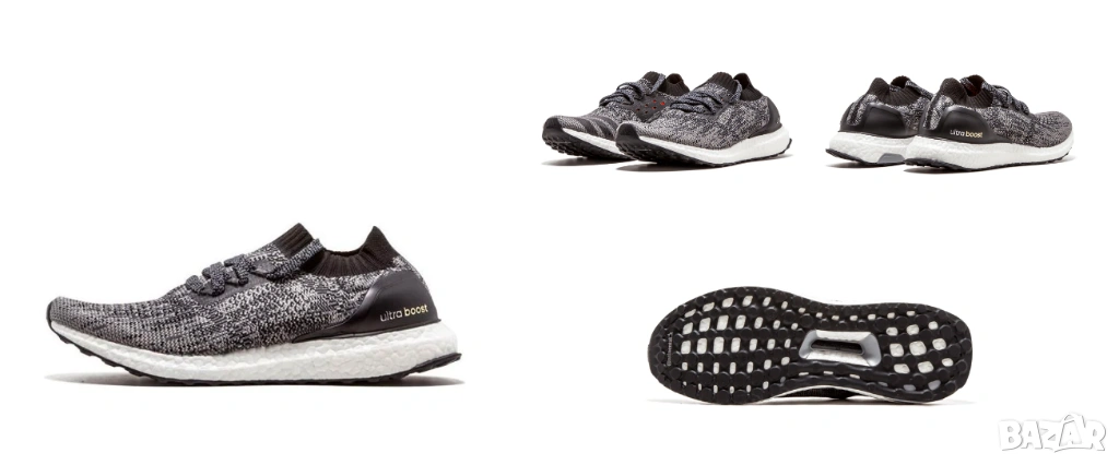 Дизайн: Комбинира нюанси на черно и сиво в плетката, със златни детайли на логото „Ultra Boost“ върху петата и метални накрайници на връзките.