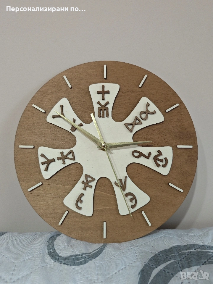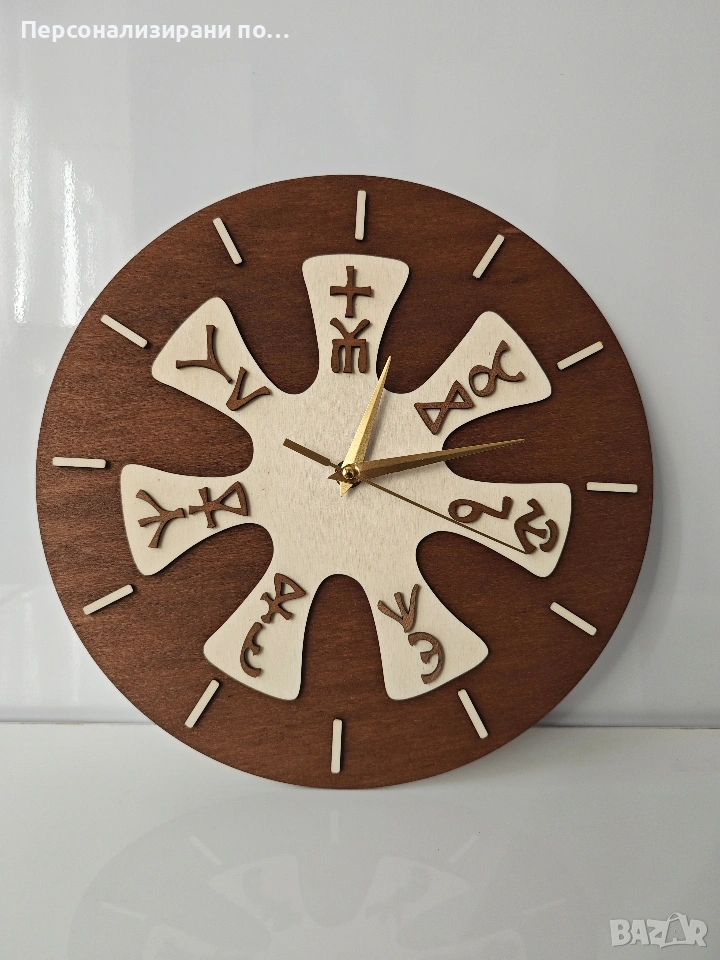Тагове: стенен часовник, часовник за стена, Розетата от Плиска; азбука; глаголица; лазерно рязане и гравиране; подарък за всеки повод; механизъм; шперплат;